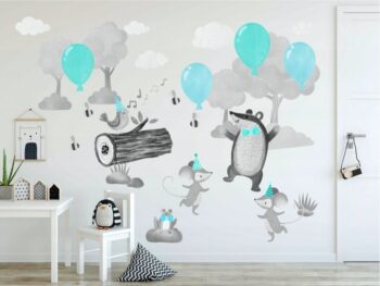 Veľká nálepka na stenu modro žltá zajačikova a balóny 100 x 200 cm