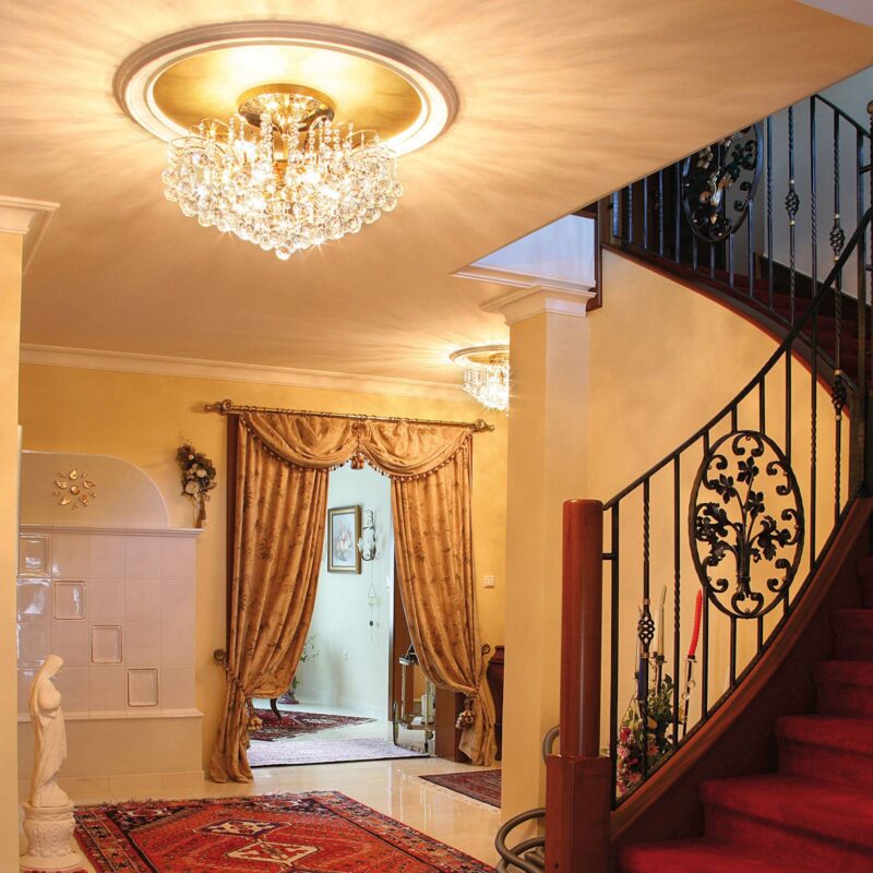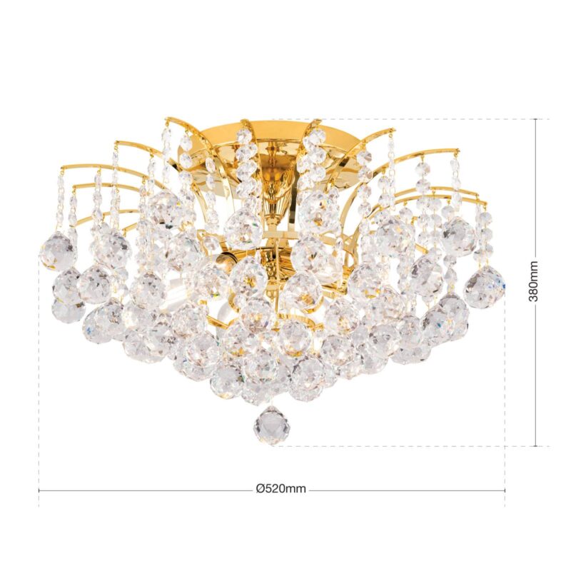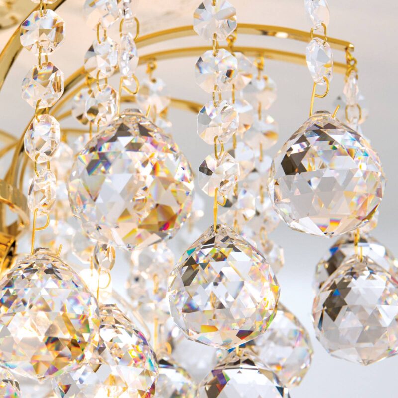 Stropné svietidlo LENNARDA s pozlátením a čírymi krištáľovými guľkami Jagavé zlato, trblietavé krištáľové guľôčky a pôsobivé svetelné efekty charakterizujú stropné svietidlo LENNARDA. Jeho kovová konštrukcia je pozlátená 24-karátovým zlatom, ktoré zdôrazňuje jeho kvalitný vzhľad. Konštrukcia je ovešaná mnohými krištáľovými prvkami s priemerom 40 mm, ktoré toto stropné svietidlo premieňajú na bohato pôsobiaci osvetľovací objekt. Za krištáľovým závesom sa ukrýva šesť žiaroviek (nie sú súčasťou balenia) poskytujúce svetelnú žiaru, ktorá sa láme na krištáľoch, šíri sa do priestoru a vytvára zaujímavé svetelné akcenty. Rakúsky výrobca nadchýna zákazníkov svojimi vysokokvalitnými svietidlami s dlhou životnosťou už od roku 1948. Mimoriadny dôraz pritom kladie na atraktívny dizajn, ktorý je inšpiráciou pre zákazníkov z celého sveta. Tí dôverujú kvalite rakúskeho remesla, vďaka ktorej je každé svietidlo ručne vyrobeným originálom.
