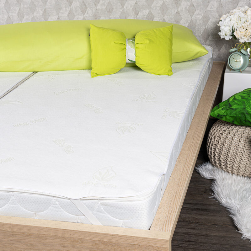 Skvelý pomocník pre zdravý spánok. Tento unikátny chránič matraca Aloe Vera prinesie vašej posteli dokonalú čistotu aj maximálne pohodlie. Je mäkký, priedušný a vďaka obsahu blahodarných výťažkov z Aloe Vera má pozitívne účinky na zdravie (najmä pokožku), pomáha upokojeniu a relaxácii, a navyše sa môže pochváliť antibakteriálnymi vlastnosťami. Pravidelné používanie chrániča predlžuje životnosť vášho matraca a zabraňuje prenikaniu potu aj špiny do matraca, zaručí tak dokonalú hygienu vášho lôžka. Chránič matraca ľahko zvlečiete a vyperiete, takže údržba je takmer bez práce.