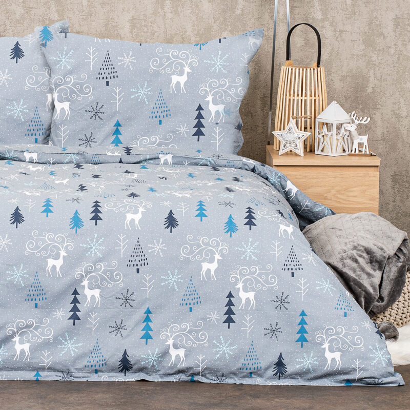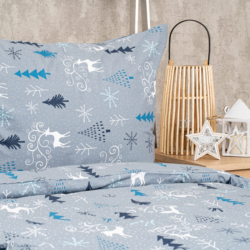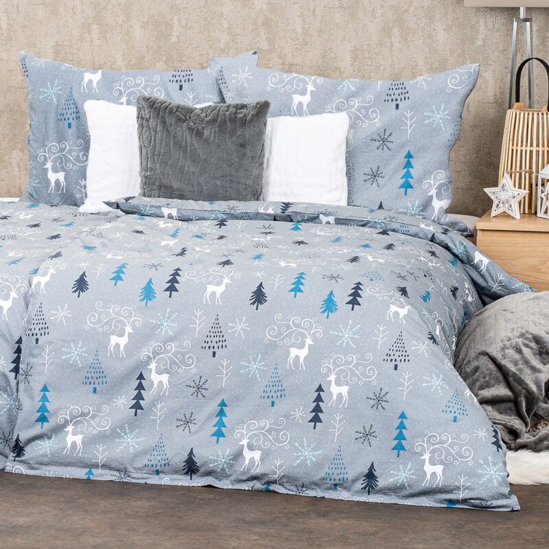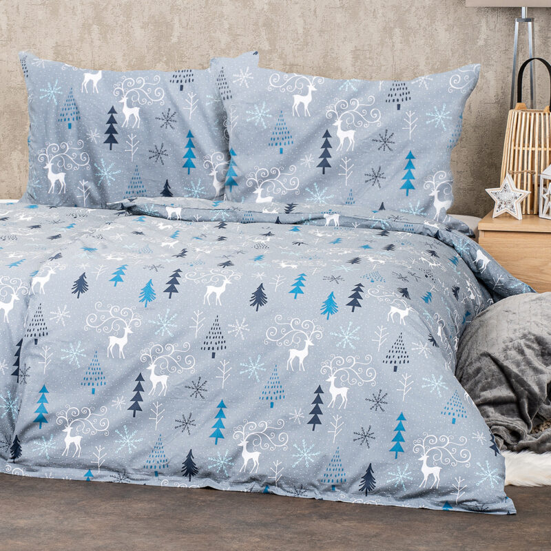 Zimná elegancia pre každú spálňu. Doprajte si pohodlný spánok vďaka bavlneným obliečkam s originálnym motívom s jeleňmi. Decentný sivý podklad a krásny zimný vzor v bielej, petrolejovej a tyrkysovej navodí vo vašej spálni perfektnú pohodu pre tú správnu relaxáciu a odpočinok. Príjemná a kvalitná 100% bavlna zaručí príjemné zaspávanie a maximálny komfort počas spánku. Obliečky majú z oboch strán rovnaký vzor a sú opatrené zapínaním na zips.Súprava obsahuje:1x obliečka na vankúš 70 x 90 cm1x obliečka na prikrývku 140 x 220 cm