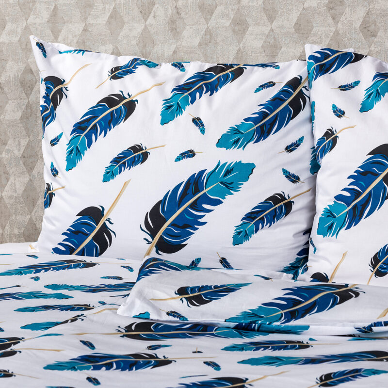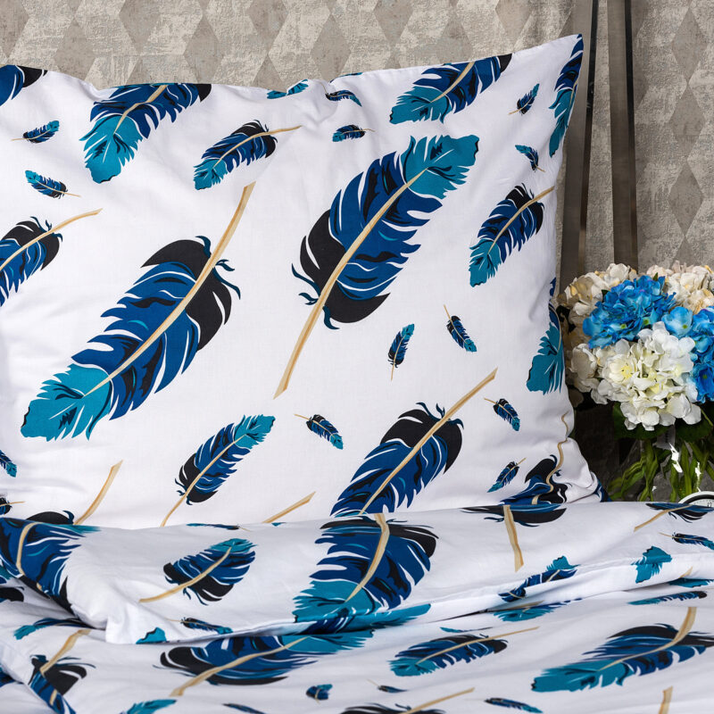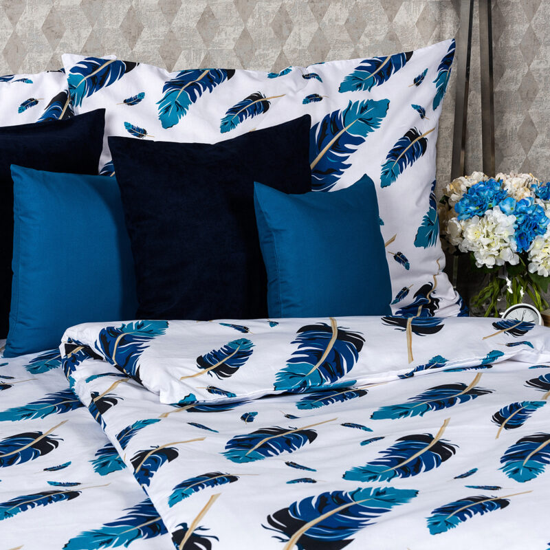 Jednoduché, elegantné, mystické. Ako pohladením pierka vás ukolíšu k spánku originálne bavlnené obliečky v ukľudňujúcej farebnej kombinácii. Motív pierok v modrých odtieňoch na kontrastnom bielom podklade pôsobí jemne i vzdušne, dodá tak vašej spálni jednoduchý a osobitý štýl.Obliečky sú vyrobené z kvalitnej 100% bavlny, ktorá zaručí príjemné zaspávanie. Vzor je z oboch strán rovnaký. Pohodlné zapínanie na zips.Súprava obsahuje: