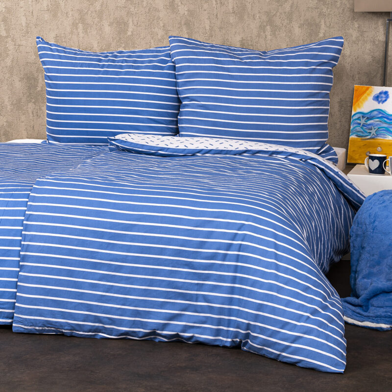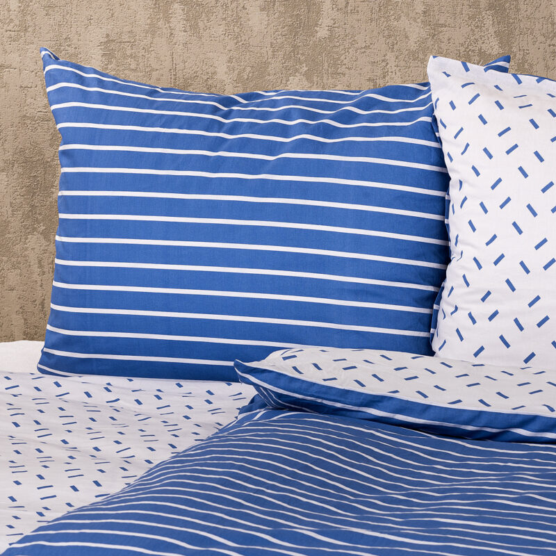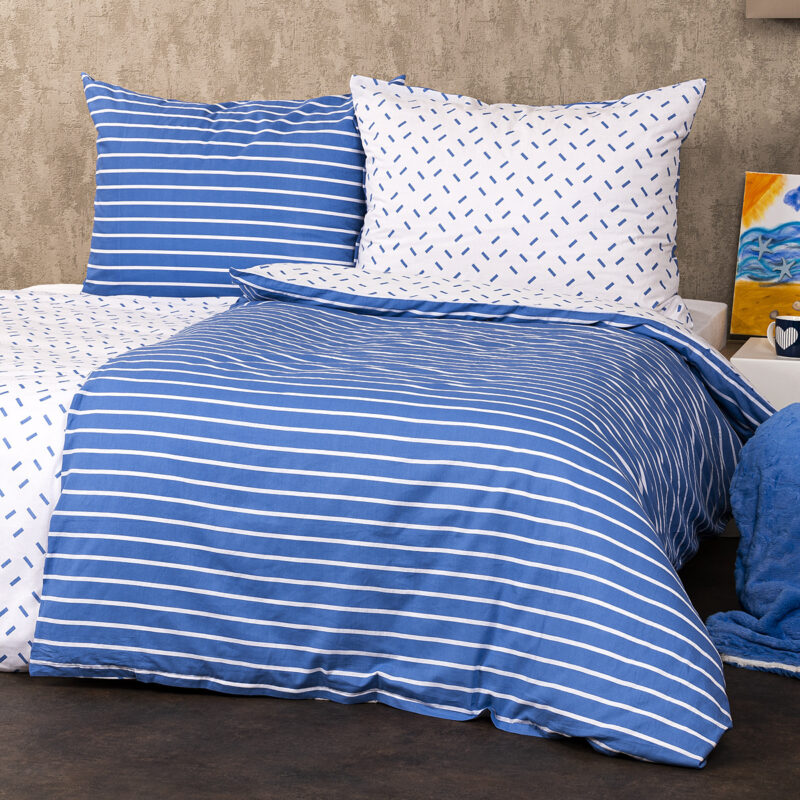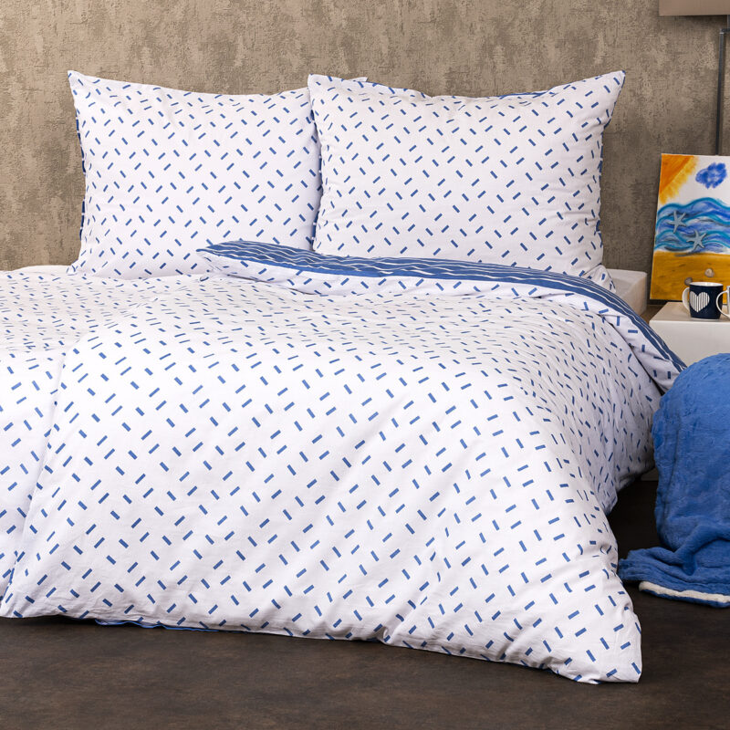 Nebesky modré bavlnené obliečky pre zaspávanie ako na tom najmäkšom obláčiku. Spojenie upokojujúce modrej a jednoduchých geometrických vzorov je potešením pre každé oko. Doprajte svojej spálni jednoduchú eleganciu a svieži dizajn. Zaspávajte v mäkkej a príjemnej 100% bavlne, ktorá zaručí pohodlný spánok.Obliečky sú obojstranné – z jednej strany modré s jemnými bielymi prúžkami, druhá strana je biela s drobným geometrickým vzorom. Môžete ich teda ľubovoľne kombinovať a meniť svoju posteľ každý deň. Pre maximálne pohodlie majú obliečky praktické zapínanie na zips.Súprava obsahuje: