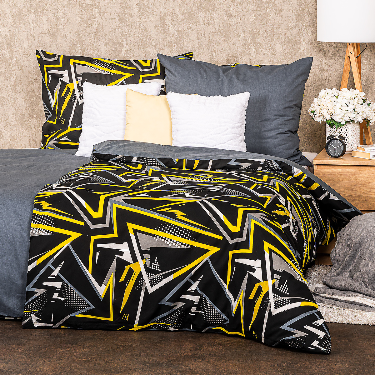 Bavlnené obliečky s originálnym abstraktným vzorom zaručene oživia každú posteľ. Mladistvá kombinácia čiernej, žltej a sivej dodá interiéru nový svieži šmrnc a vďaka modernému dizajnu sa obliečky budú dobre vynímať v klasickej spálni, čisto chlapskej izbe alebo napríklad v izbách dospievajúcich ratolestí. Navyše sú vyrobené z mäkkej a príjemnej 100% bavlny, ktorá zaručí pohodlie a kvalitný spánok.Obliečky sú obojstranné – z jednej strany moderný vzor, druhá strana je jednofarebná, sivá. Môžete ich teda ľubovoľne kombinovať a meniť svoju posteľ každý deň. Pre maximálne pohodlie majú obliečky praktické zapínanie na zips.Súprava obsahuje: