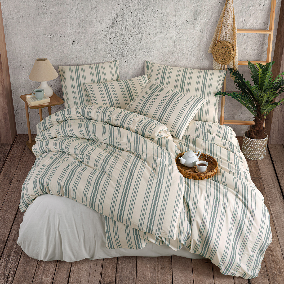 Originálne a vysoko kvalitné obliečky Stripes ponúkajú nielen pohodlný spánok, ale sú aj elegantným a nadčasovým doplnkom pre každú spálňu. Jemná béžová farba s pruhmi v sivozelenom odtieni vytvára pohodovú a útulnú atmosféru, kedy pri každom pohľade zatúžite po odpočinku a relaxácii.Obliečky sú vyrobené metódou yarn-dyed – jedná sa o prastarú metódu tkania a výroby textilu, kedy sa cievky priadzí farbia samostatne pred tkaním látky. Vopred zafarbené vlákna sú potom usporiadané do požadovaného vzoru a štruktúry pomocou tkacieho stroja. Prednosťou tejto metódy je hlavne kvalita odolnosť, pretože farba nebledne tak rýchlo, ako pri látkach farbených až po tkaní.Súprava obsahuje: