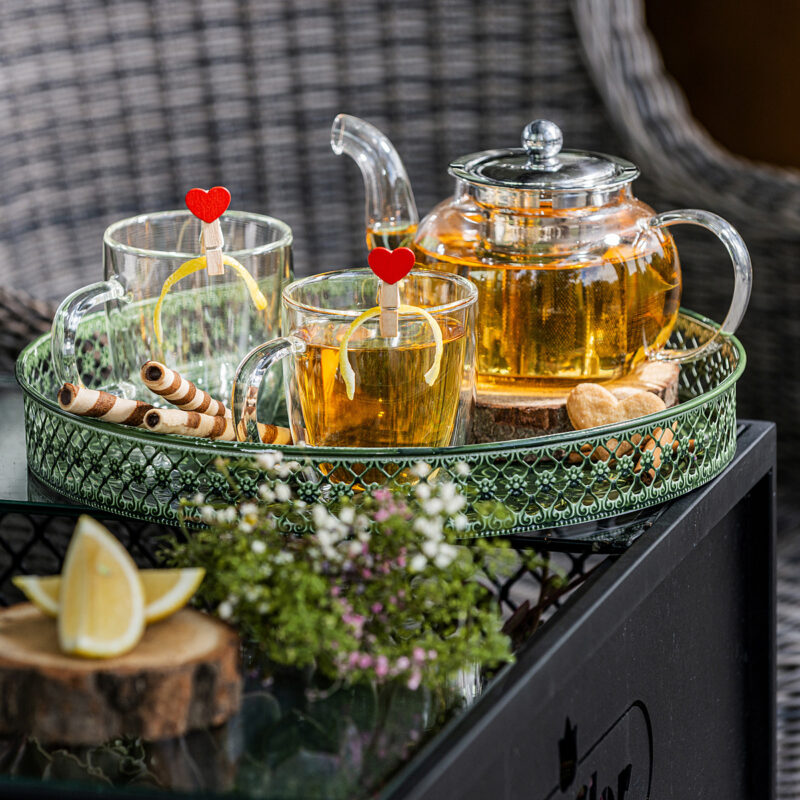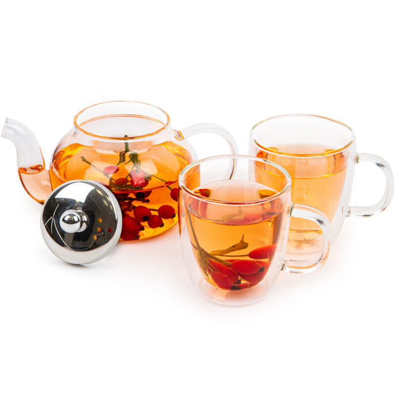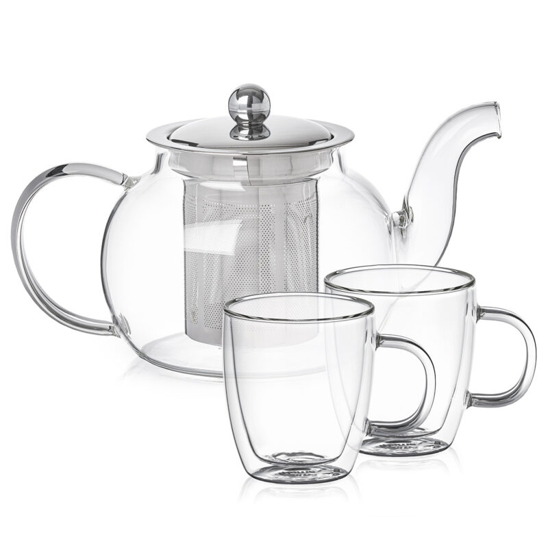 Sada Tea time je ručne vyrobená z ľahkého žiaruvzdorného borosilikátového skla. Výhodou borosilikátového skla oproti sklu tradičnému je jeho vysoká odolnosť voči vysokým a nízkym teplotám, mechanickému poškodeniu a pôsobeniu chemikálií.Poháre majú dvojitú stenu, ktorá vďaka vytvorenému vákuu dokáže dlho udržať ideálnu teplotu a neprenáša teplo ani chlad na vonkajšiu časť. Vďaka termoizolačným vlastnostiam tak zostáva pohár aj pri použití horúceho nápoja chladný a nepáli.Výhody: