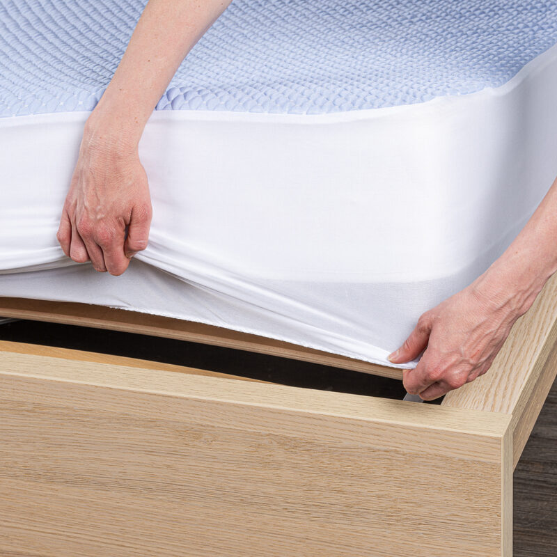 Pokojný a zdravý spánok aj v tých najväčších horúčavách? Kúpte si chladiaci chránič matraca! Tento unikátny chránič tvoria z 30 % špeciálne chladiace vlákna, ktoré zaistia príjemný spánok, ak napríklad trpíte nadmerným potením a príjemne vás ochladí aj počas teplých dní. Je mäkký, priedušný a zaistí maximálne pohodlie. Pravidelné používanie chrániča predlžuje životnosť vášho matraca a zabraňuje prenikaniu potu aj špiny do matraca, zaručí tak dokonalú hygienu vášho lôžka. Chránič matraca ľahko zvlečiete a vyperiete, takže údržba je takmer bez práce. Chránič je opatrený praktickým lemom pre jednoduché uchytenie k matracu – používa sa rovnako jednoducho ako napínacie prestieradlo a je vhodný na matrac s maximálnou výškou 30 cm. Chránič matraca je opatrený certifikátom Öko-Tex Standard 100.