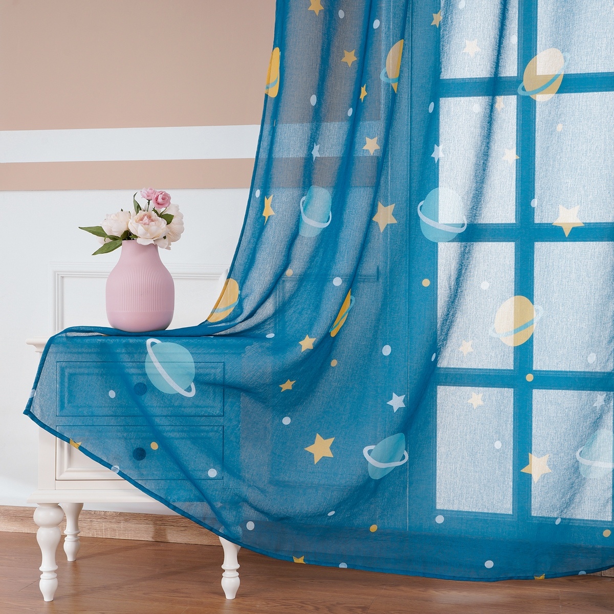 Doprajte svojim deťom dokonale útulnú izbičku s veselou voálovou záclonou. Vesmírny motív poteší všetkých malých dobrodruhov. Veselý modrý podklad doplnený svetlomodrým a žltým motívom hviezd a planét dodá izbičke úplne nové kúzlo.Voály umožňujú prirodzenému svetlu zvonku príjemne osvetliť váš domov. Jemná štruktúra látky funguje ako rozptyľovač, vďaka čomu svetlo získa príjemný mäkký tón. Jednoduché zavesenie na krúžky s vnútorným priemerom 4 cm. Jednoduchá údržba zaistia maximálne pohodlie.