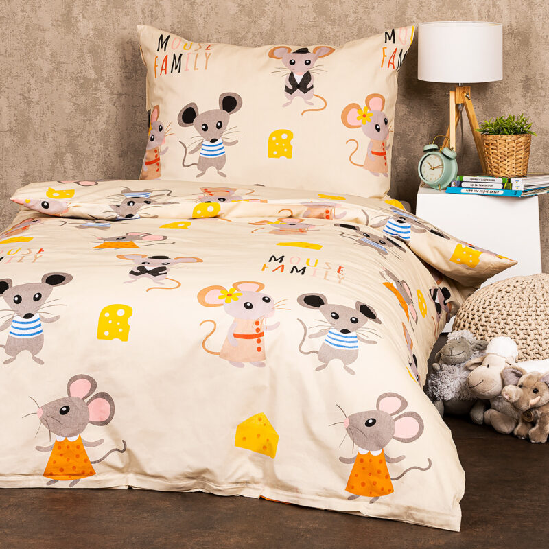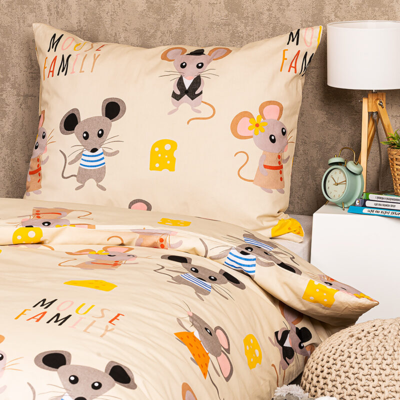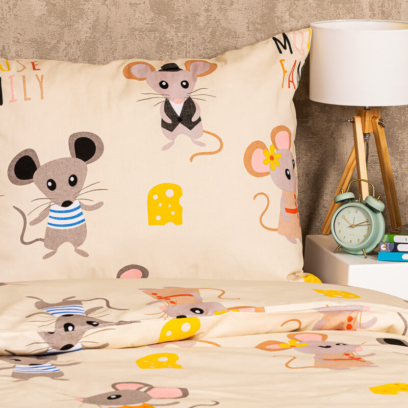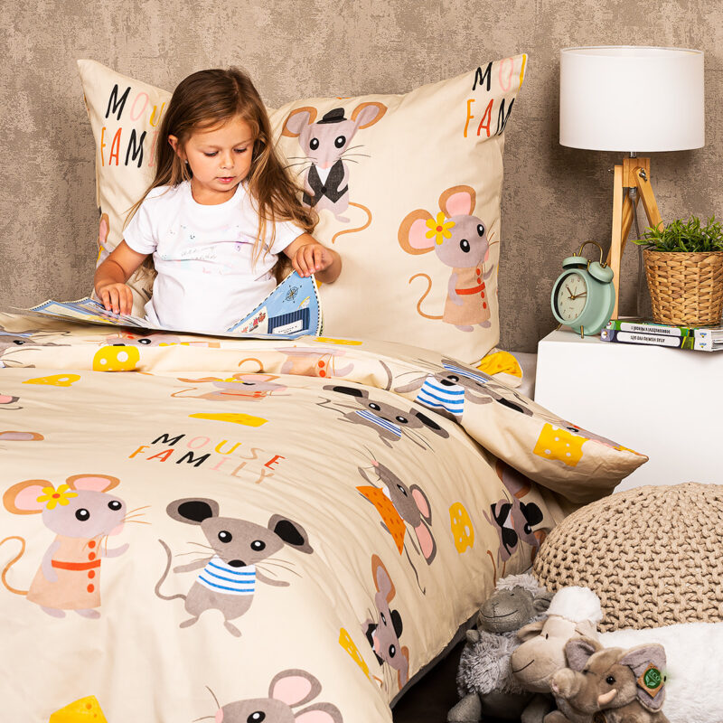 S roztomilou rodinou malých myšiek budú vaše ratolesti spinkať ako v rozprávke. Veselé bavlnené obliečky v neutrálnej béžovej farbe bude dokonalou ozdobu každej izbičky. Deti si ich zamilujú vďaka roztomilému vzoru s myškami, ktorý zaručene vyčarí úsmev na tvári aj vám.Kvalitná 100% bavlna zabezpečí maximálny komfort a je šetrná aj k citlivej detskej pokožke. Môžete tak zaspávať s vedomím, že o pohodlie vašich ratolestí je postarané do najmenšieho detailu. Obliečky majú praktické zapínanie na zips.Súprava obsahuje: