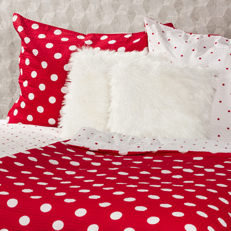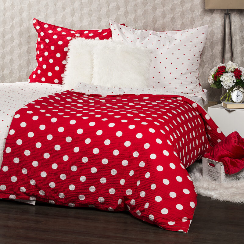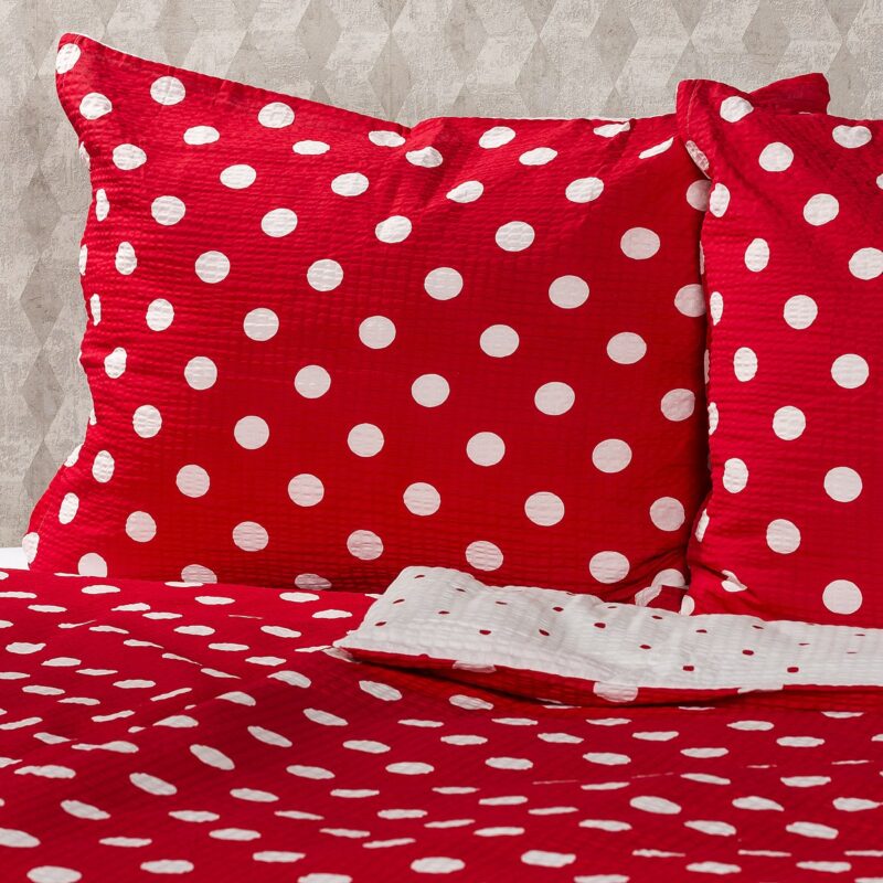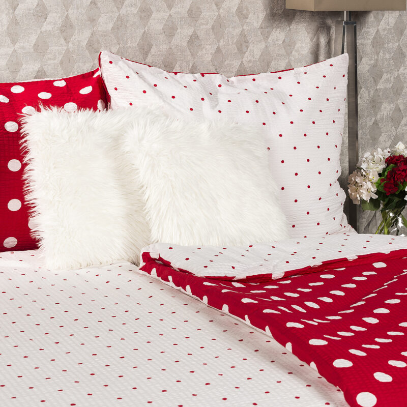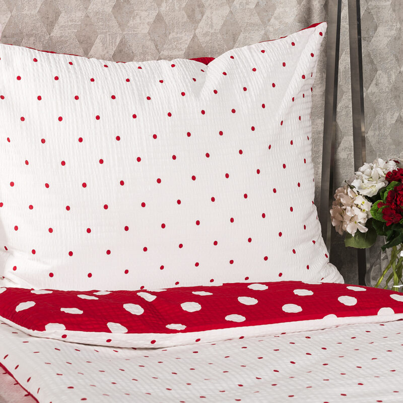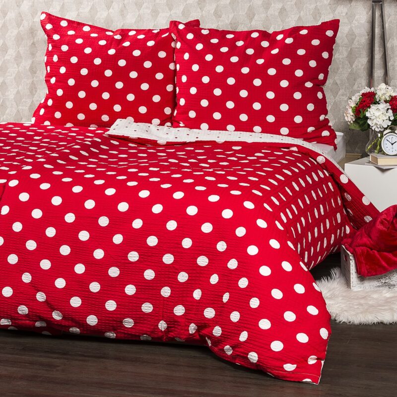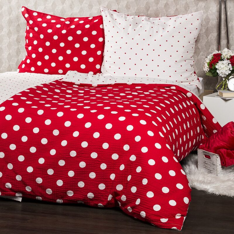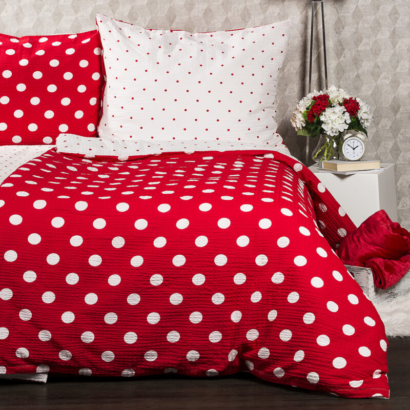 Oživte svoj domov originálnymi krepovými obliečkami s bodkami. Obľúbený vzor bodiek si zamilujú všetci milovníci originality a hravého designu. Klasické červeno-biele prevedenie navyše dodá šmrnc každej spálni. Tradičný bavlnený krep je obľúbený najmä pre svoju nenáročnú údržbu – nemusí sa totiž vôbec žehliť.Obliečky sú obojstranné – z jednej strany veľké biele bodky na červenom podklade, z druhej strany drobné červené bodky na bielom podklade – môžete ich teda ľubovoľne kombinovať a meniť svoju posteľ každý deň. Pre maximálne pohodlie majú obliečky praktické zapínanie na zips.Súprava obsahuje: