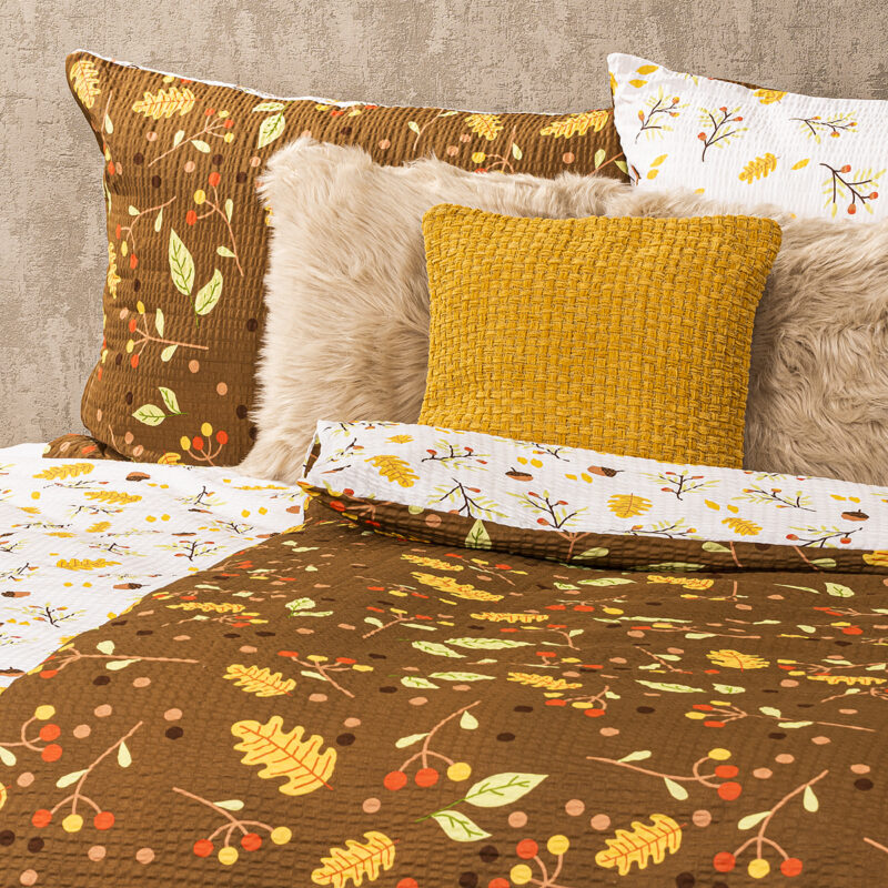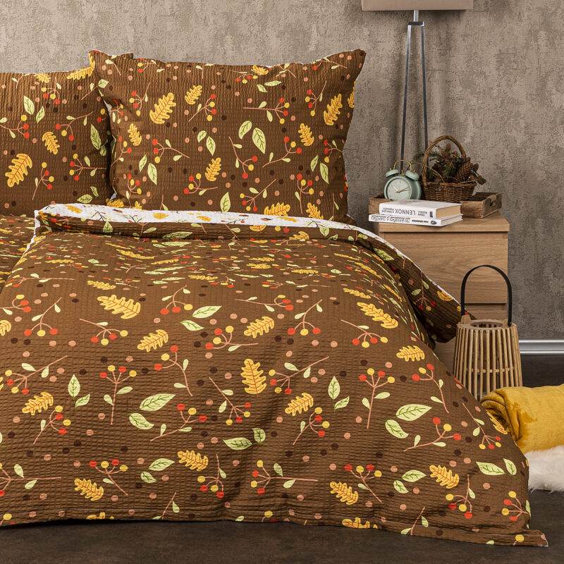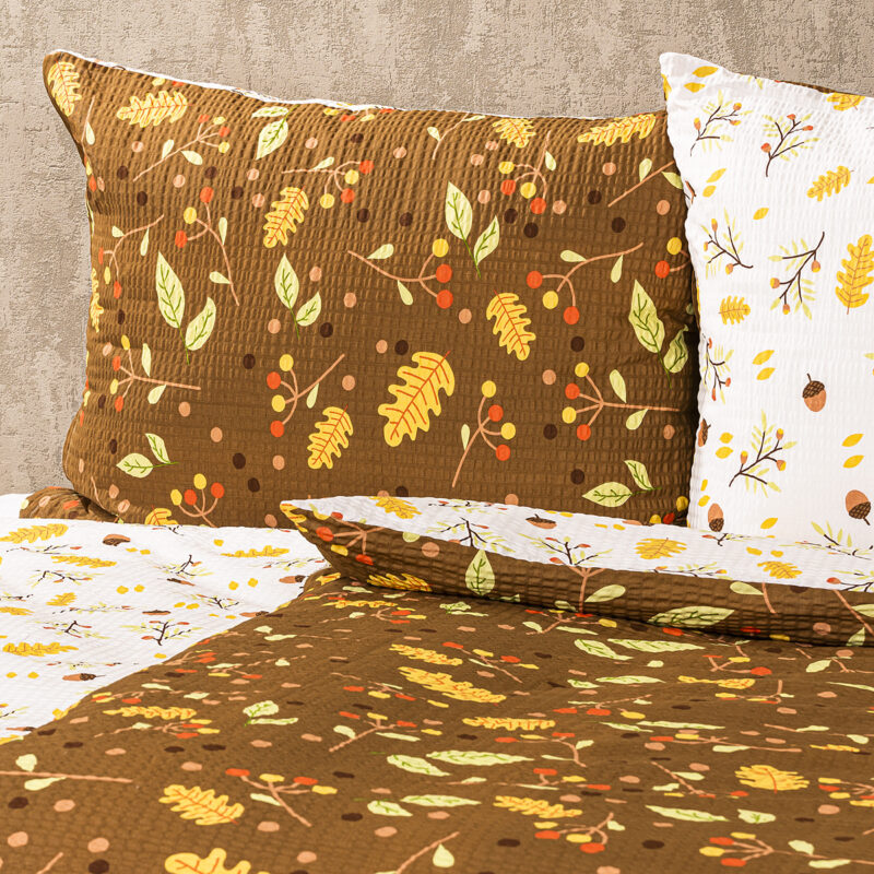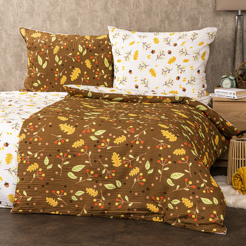Hrejivé farby jesene vnesú do vašej spálne teplo domova a zaistia pohodové zaspávanie ako pri tichom šušťaní jesenného lístia vo vetre. Štýlové krepové obliečky potešia upokojujúcou kombináciou prírodných farieb a motívov, ktorá zahreje na duši aj keby vonku zúrili plieskanice. Praktický bavlnený krep je skvelým materiálom pre ľahkú údržbu, kombinuje totiž mäkkosť a pohodlie bavlny s praktickou nežehlivou úpravou.