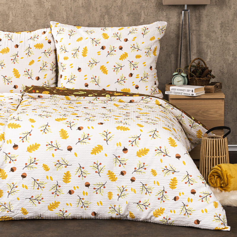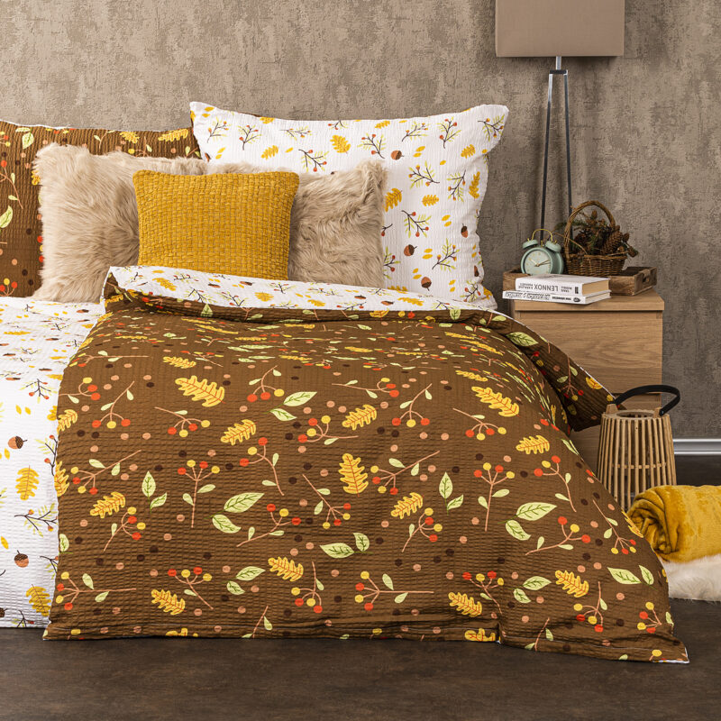 Obliečky sú obojstranné – z jednej strany jesenné prírodné motívy na bielom podklade, z druhej strany na hnedom podklade. Môžete ich teda ľubovoľne kombinovať a meniť svoju posteľ každý deň. Pre maximálne pohodlie má obliečky praktické zapínanie na zips.Súprava obsahuje: