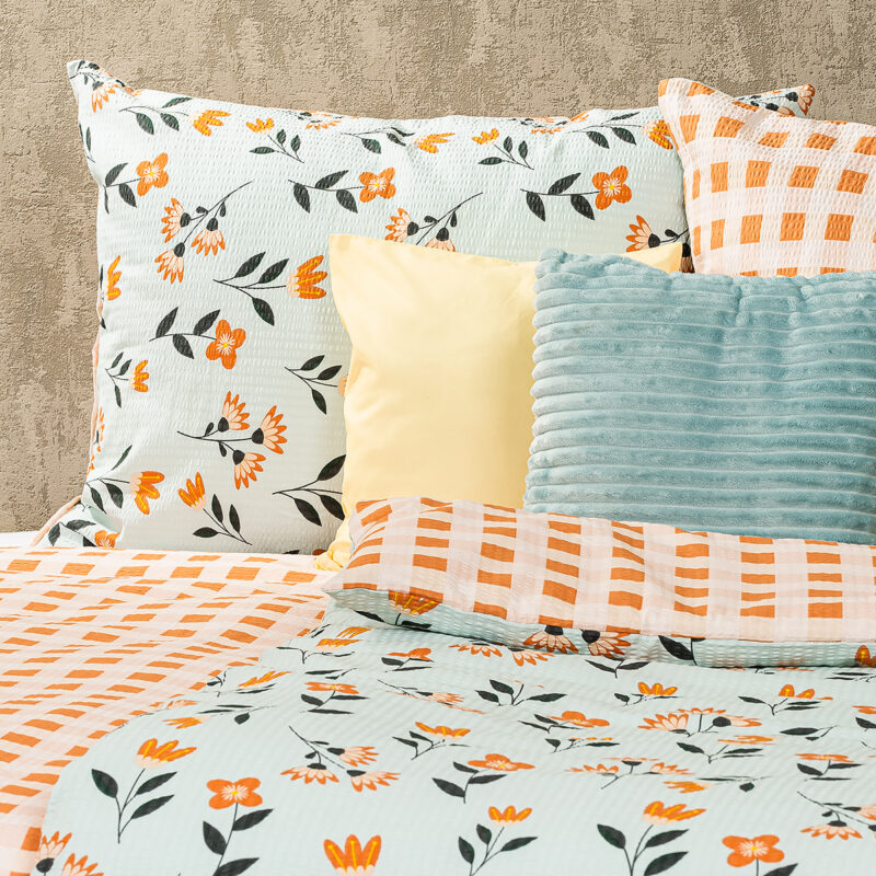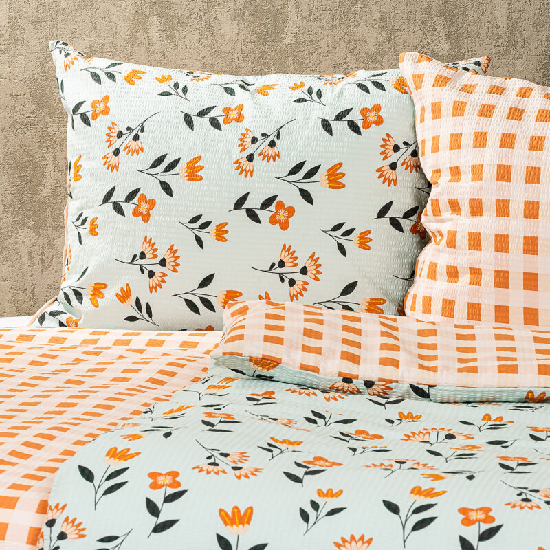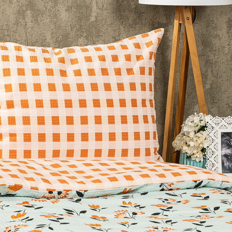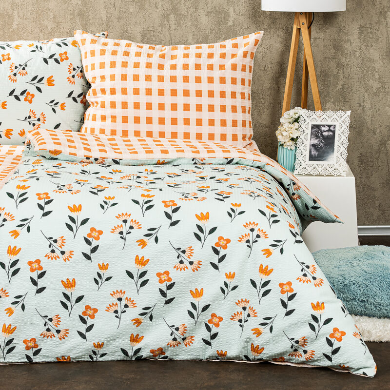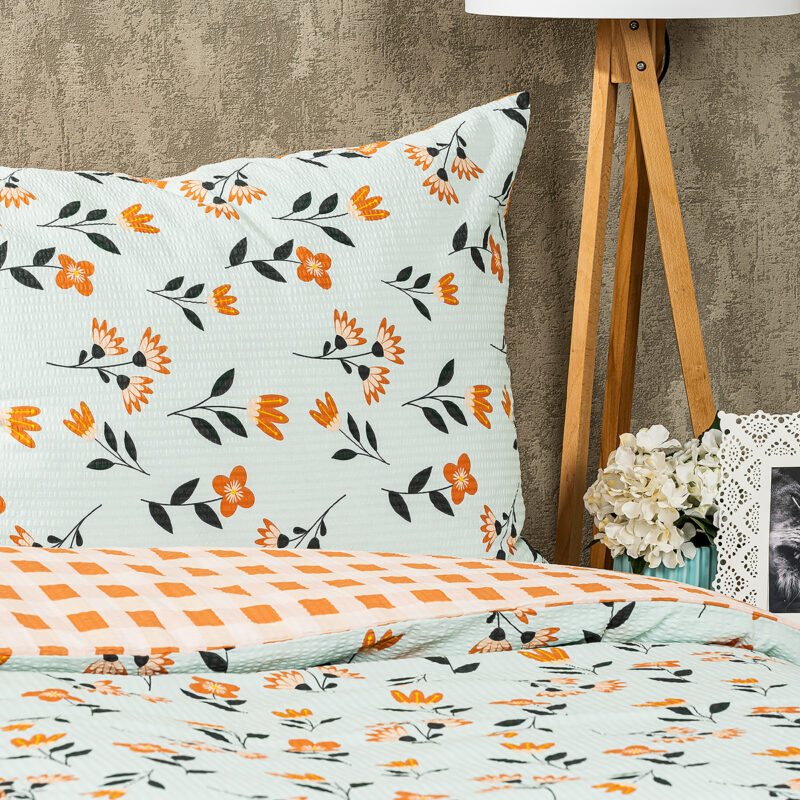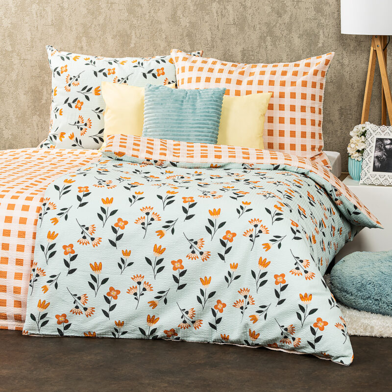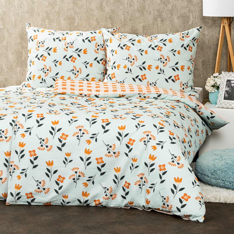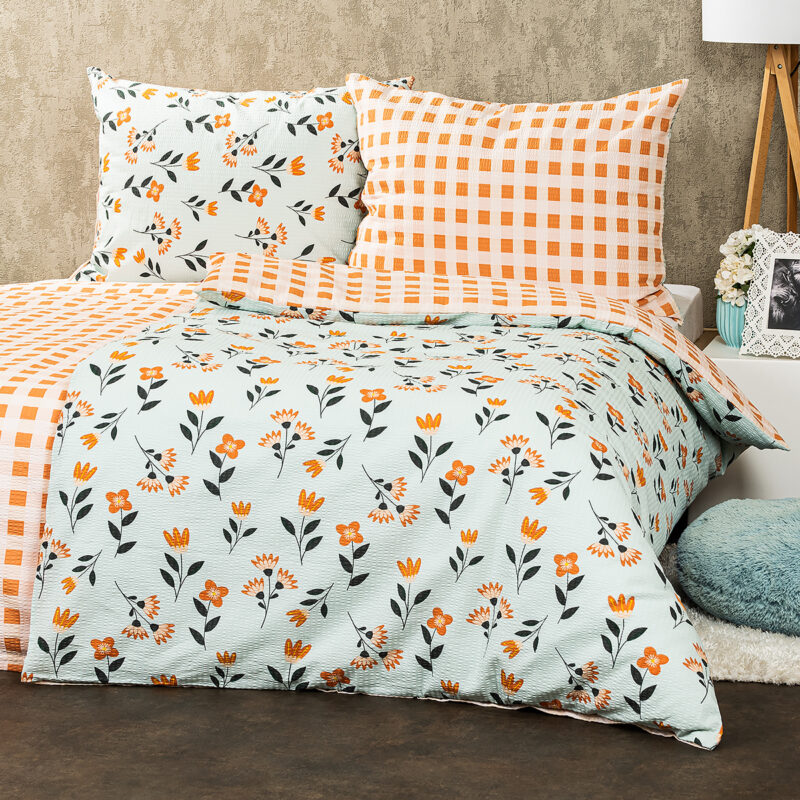 Krepové obliečky v príjemných pastelových farbách prinesú vašej spálni kúzelnú jarnú atmosféru po celý rok. Kombinácia optimistických farieb s kvetinovým vzorom a obľúbenou kockou pôsobí relaxačným dojmom a zaručí dokonale pohodové zaspávanie. Obliečky sú obojstranné – jedna strana mentolovo zelená s oranžovým kvetinovým vzorom, druhá je kockovaná v odtieňoch oranžovej.Praktický bavlnený krep je skvelým materiálom pre ľahkú údržbu, kombinuje totiž mäkkosť a pohodlie bavlny s praktickou nežehlivou úpravou. Obliečky majú zapínanie na zips.Súprava obsahuje: