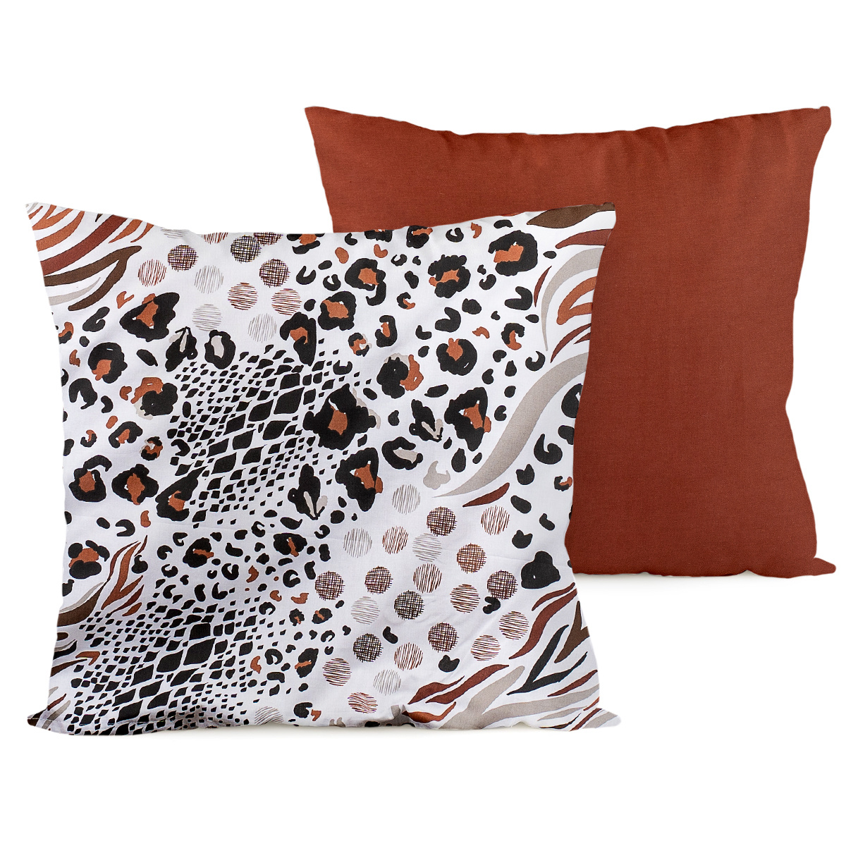 Bavlnená obliečka na vankúšik v prírodnom dizajne dodá vášmu domovu nádych divočiny. Pútavá kombinácia zvieracích vzorov a hrejivej hrdzavo hnedej farby vás v okamihu prenesie na africké safari. Obliečka je obojstranná – z jednej strany zvierací vzor, druhá strana je jednofarebná, hrdzavo hnedá. Je vyrobená z príjemnej a pohodlnej 100% bavlny a má zapínanie na zips.