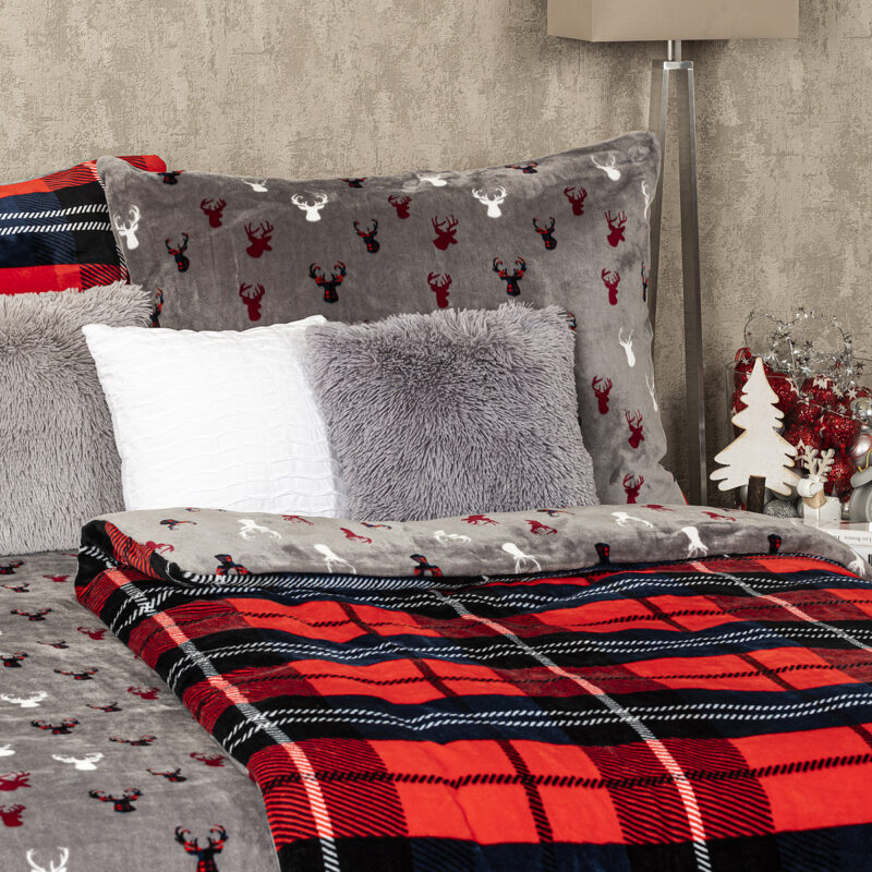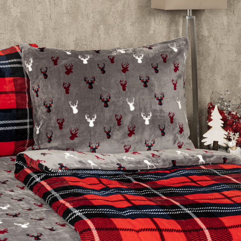 Obliečky sú obojstranné – z jednej strany klasický tartanový vzor, z druhej originálny motív jeleňov na sivom podklade – môžete ich teda ľubovoľne kombinovať a meniť svoju posteľ každý deň. Pre maximálne pohodlie majú obliečky praktické zapínanie na zips.Súprava obsahuje:
