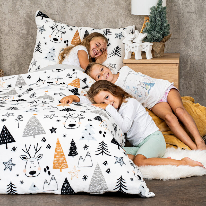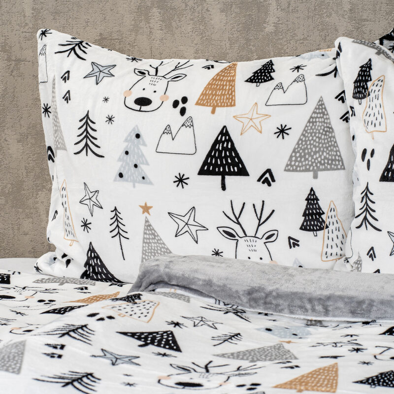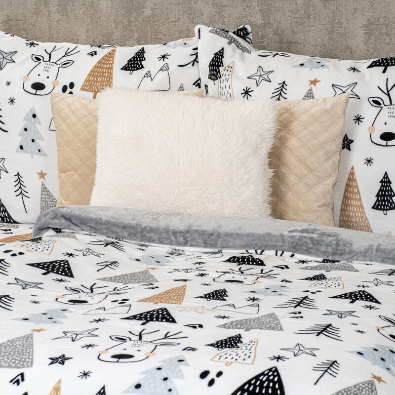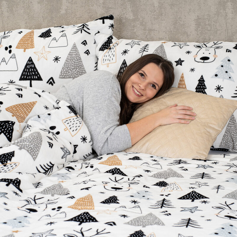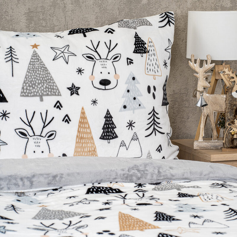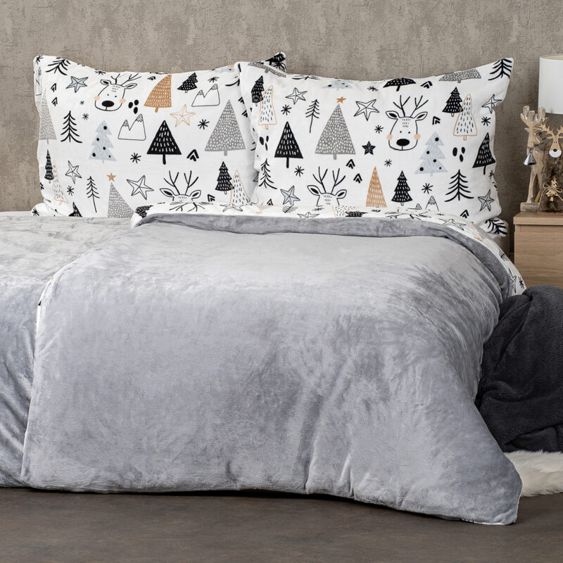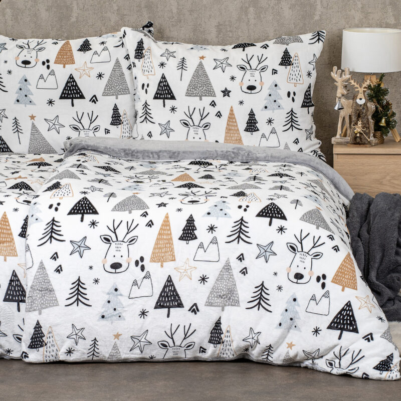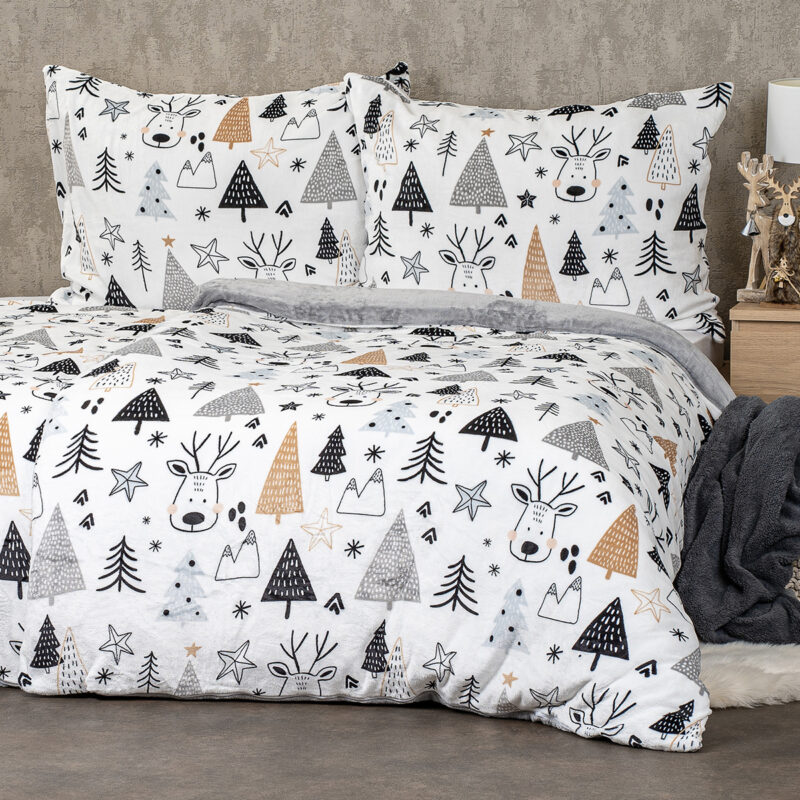 Zababušte sa do jemných obliečok z mikroflanelu a užite si zimu pekne v teple. Motív s veselými zimnými prvkami, ako sú stromčeky, hviezdy a sobíci, vytvára útulnú atmosféru, ktorá vám zaručene spríjemní odpočinok a dodá spálni sviatočný nádych. Vzor v neutrálnych a teplých odtieňoch sivej, čiernej a bielej sa ľahko zladí s rôznymi interiérmi.