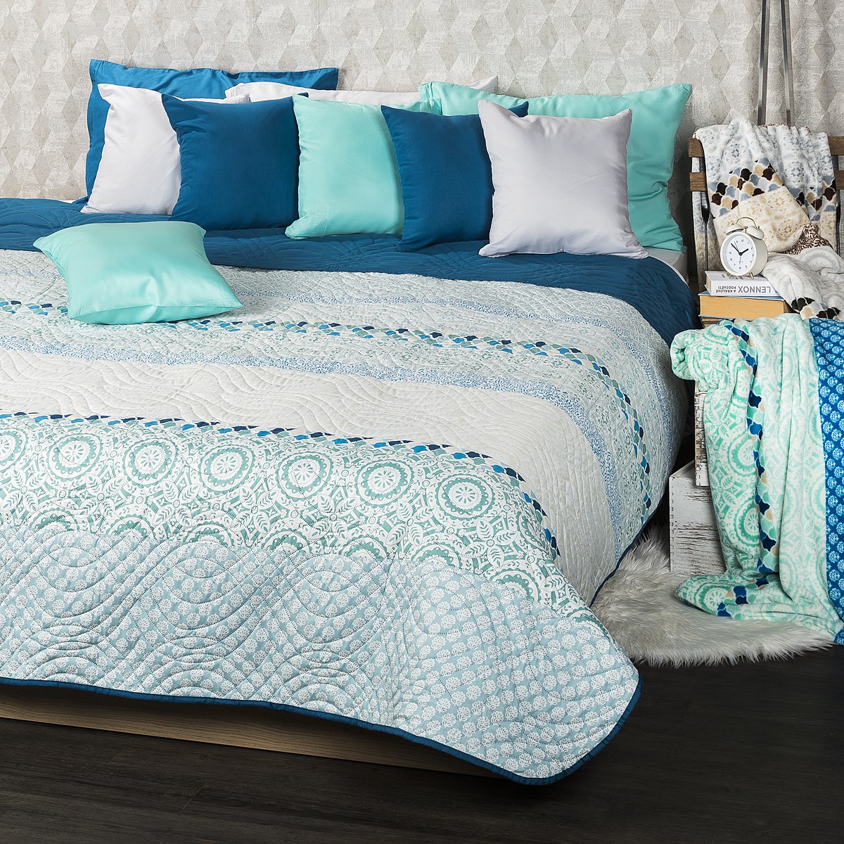 Atraktívny obojstranný prehoz na posteľ v dvojfarebnom prevedení je štýlovým i praktickým doplnkom každej spálne. Z jednej strany má prehoz pútavý vzor zložený z geometrických tvarov, z druhej strany je tmavomodrý – získate tak vlastne dva prehozy v jednom, stačí si len zvoliť, na akú farbu máte práve náladu. Prehoz ochráni vaše obliečky pred vyblednutím aj všadeprítomným prachom, navyše bude vaša posteľ vždy rýchlo ustlaná. Mäkučký materiál s originálnym prešitím dokonale kopíruje tvar nábytku. Prehoz môžete tiež použiť ako veľkú deku, do ktorej sa zababuší celá rodina.Dekoračné vankúšiky nie sú súčasťou balenia.