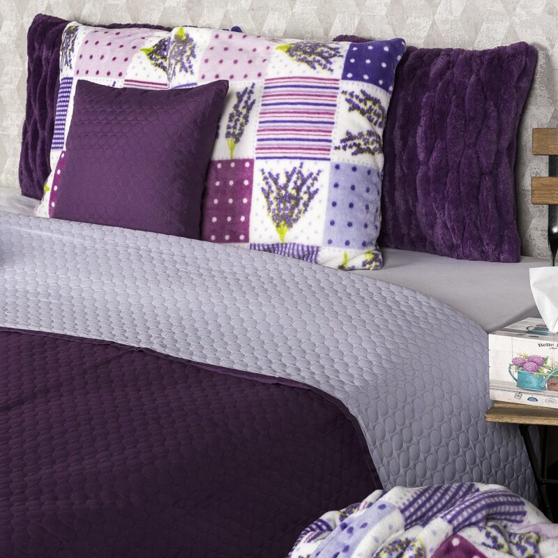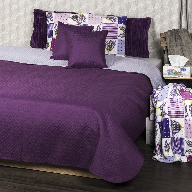 Atraktívny obojstranný prehoz na posteľ v dvojfarebnom prevedení je štýlovým i praktickým doplnkom do každej spálne. Vďaka unikátnemu farebnému ladeniu v dvoch odtieňoch fialovej získate vlastne dva prehozy v jednom – stačí si len zvoliť, na akú farbu máte práve náladu. Prehoz ochráni vaše obliečky pred vyblednutím aj všadeprítomným prachom, navyše bude vaša posteľ vždy rýchlo ustlaná. Mäkučký materiál s originálnym plastickým vzorom dokonale kopíruje tvar nábytku. Prehoz môžete tiež použiť ako veľkú deku, do ktorej sa zababuší celá rodina.Súčasťou balenia sú dve obliečky na vankúšiky s rovnakým vzorom ZADARMO.Sada obsahuje: