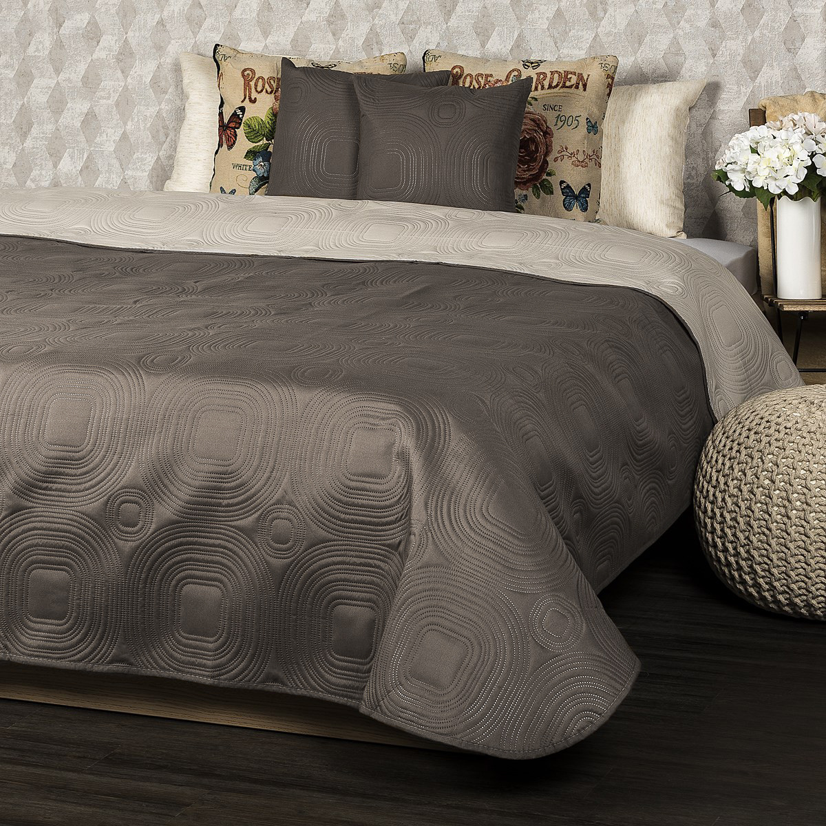Atraktívny obojstranný prehoz na posteľ v dvojfarebnom prevedení je štýlovým aj praktickým doplnkom do každej spálne. Vďaka unikátnemu farebnému ladeniu v hnedej a béžovej získate vlastne dva prehozy v jednom – stačí si len zvoliť, na akú farbu máte práve náladu. Prehoz ochráni vaše obliečky pred vyblednutím aj všadeprítomným prachom, a navyše bude vaša posteľ vždy rýchlo ustlaná. Mäkučký materiál s originálnym plastickým vzorom dokonale kopíruje tvar nábytku. Prehoz môžete tiež použiť ako veľkú deku, do ktorej sa zababuší celá rodina.Súčasťou balenia sú dve obliečky na vankúšiky s rovnakým vzorom ZADARMO.Farba produktu sa môže v skutočnosti mierne líšiť – záleží na nastavení vášho monitora alebo mobilného zariadenia.Súprava obsahuje: