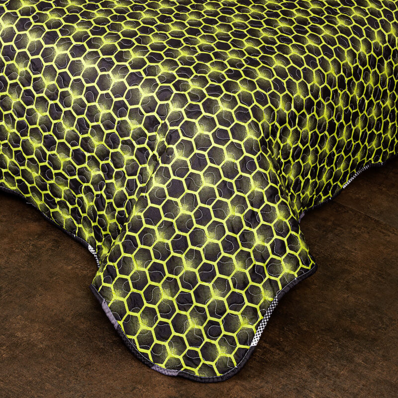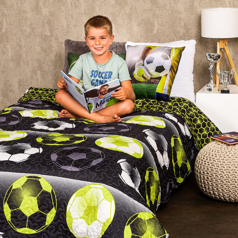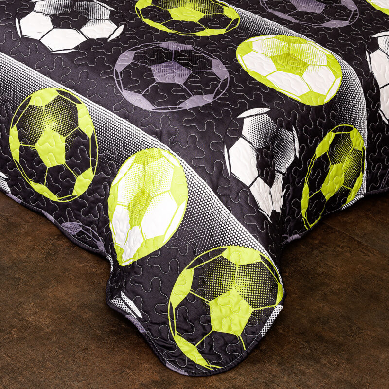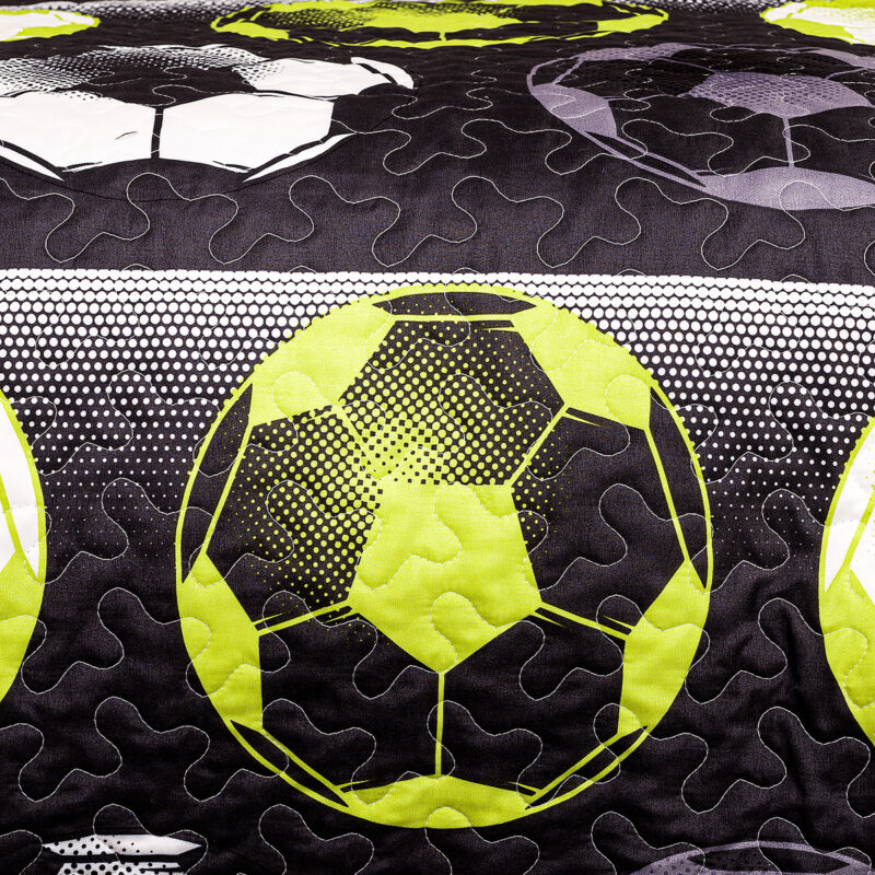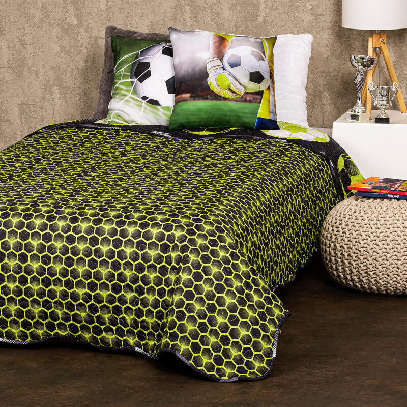 Prešívaný prehoz na posteľ s futbalovým motívom skvele doladí izbu všetkých malých aj veľkých futbalových nadšencov. Vďaka obojstrannému prevedeniu získate vlastne dva prehozy v jednom – z jednej strany motív futbalových lôpt v čierno-sivej so zelenožltými detailmi, druhá strana má geometrický vzor v rovnakých farbách.Prehoz na posteľ však nie je len krásny, je aj praktický. Ochráni vaše obliečky pred vyblednutím aj všadeprítomným prachom, a navyše bude vaša posteľ vždy rýchlo ustlaná. Vyrobený je z hebkého mikrovlákna a vďaka jemnosti materiálov vám môže pohodlne slúžiť aj ako deka.Vankúšiky nie sú súčasťou balenia.