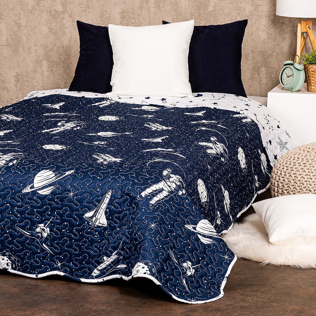 Premeňte svoju posteľ na štýlovú vesmírnu základňu s originálnym prešívaným prehozom. Vďaka obojstrannému prevedeniu získate vlastne dva prehozy v jednom – z jednej strany tmavomodrý podklad s jednoduchým bielym motívom planét a kozmonautov, druhá strana je biela so vzorom hviezd a súhvezdí. Decentný motív pôsobí elegantne, a zároveň dodá hravý tón každému interiéru. Skrátka skvelý doplnok pre malých i veľkých kozmonautov.Prehoz na posteľ však nie je len krásny, je aj praktický. Ochráni vaše obliečky pred vyblednutím aj všadeprítomným prachom, a navyše bude vaša posteľ vždy rýchlo ustlaná. Vyrobený je z hebkého mikrovlákna a vďaka jemnosti materiálov vám môže pohodlne slúžiť aj ako deka.Vankúšiky nie sú súčasťou balenia.