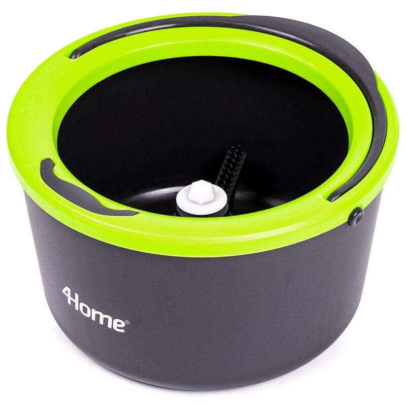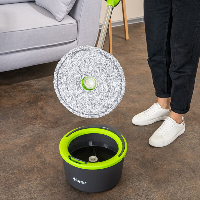 Exkluzívny rotačný mop z kolekcie 4home Rapid Clean zaistí perfektné čistenie bez námahy a vďaka kompaktnému prevedeniu tiež úsporné skladovanie. Menšie vedro s unikátnym rotačným mechanizmom poskytne nielen úsporu miesta, keď mop práve nepoužívate, ale aj ľahšiu manipuláciu a prenášanie pri upratovaní celého bytu. Odolná nehrdzavejúca tyč mopu je teleskopická, takže ju ľahko nastavíte pre svoju výšku.Vďaka unikátnej rotačnej technológii budete mať mop vždy dokonale čistý a vyžmýkaný, navyše iba jedným jednoduchým pohybom. Jednoduchým stlačením rukoväte smerom nadol aktivujete rotačný pohyb, ktorým mop skvele vyžmýkate s vynaložením minimálnej sily. Rotačný mechanizmus má dve polohy – v spodnej mop vďaka špeciálnym čistiacim výstupkom efektívne vyplákate, v tej hornej potom behom chvíľky vyžmýkate do sucha.Stieracia hlavica je vyrobená z dokonale savého husto tkaného mikrovlákna s kratším vlasom, ktoré zaistí perfektné čistenie pri mokrom i suchom vytieraní. Navyše je ľahko odnímateľná a prateľná až na 60 °C pre zaistenie maximálnej čistoty pri každom stierania.Na vyrovnanie tyče do kolmej polohy je nutné zošliapnuť spodnú časť mopu (veľké zelené koleso), na ktorej je upevnený návlek.Pre správnu funkciu mopu je potrebné vedierko naplniť približne 2,5 l vody.Výhody mopu: