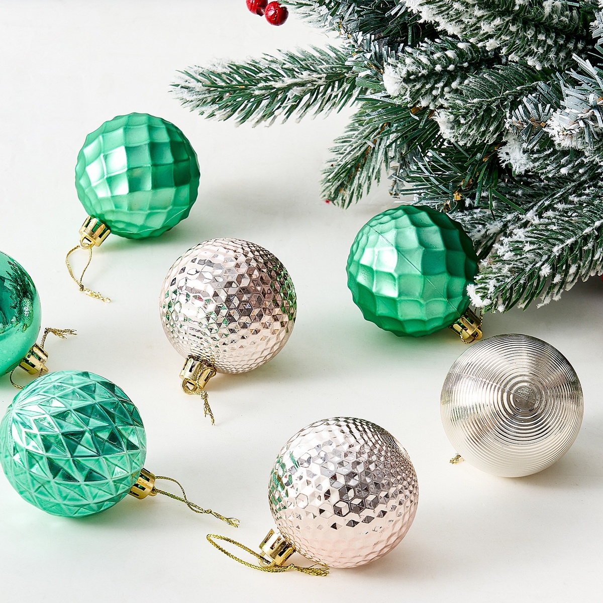 Táto nevšedná sada ozdôb kombinuje jemné pastelovo zelené a strieborné odtiene, ktoré dodajú každému vianočnému stromčeku moderný vzhľad. Zaujme na prvý pohľad a vnesie do vášho domova slávnostnú atmosféru. Súprava obsahuje guľôčky s rôznymi textúrami a vzormi, ktoré vytvárajú originálny a dynamický vzhľad. Skvele sa hodí na zdobenie nielen vianočného stromčeka, ale aj girland alebo väčších vianočných vencov.Kvalitné plastové prevedenie zaistí dlhú životnosť, vďaka čomu vám budú skvele slúžiť po mnoho rokov. Každá ozdoba je opatrená očkom a povrázkom pre ľahké zavesenie.Balenie obsahuje 25 guľôčok s priemerom 6 cm.