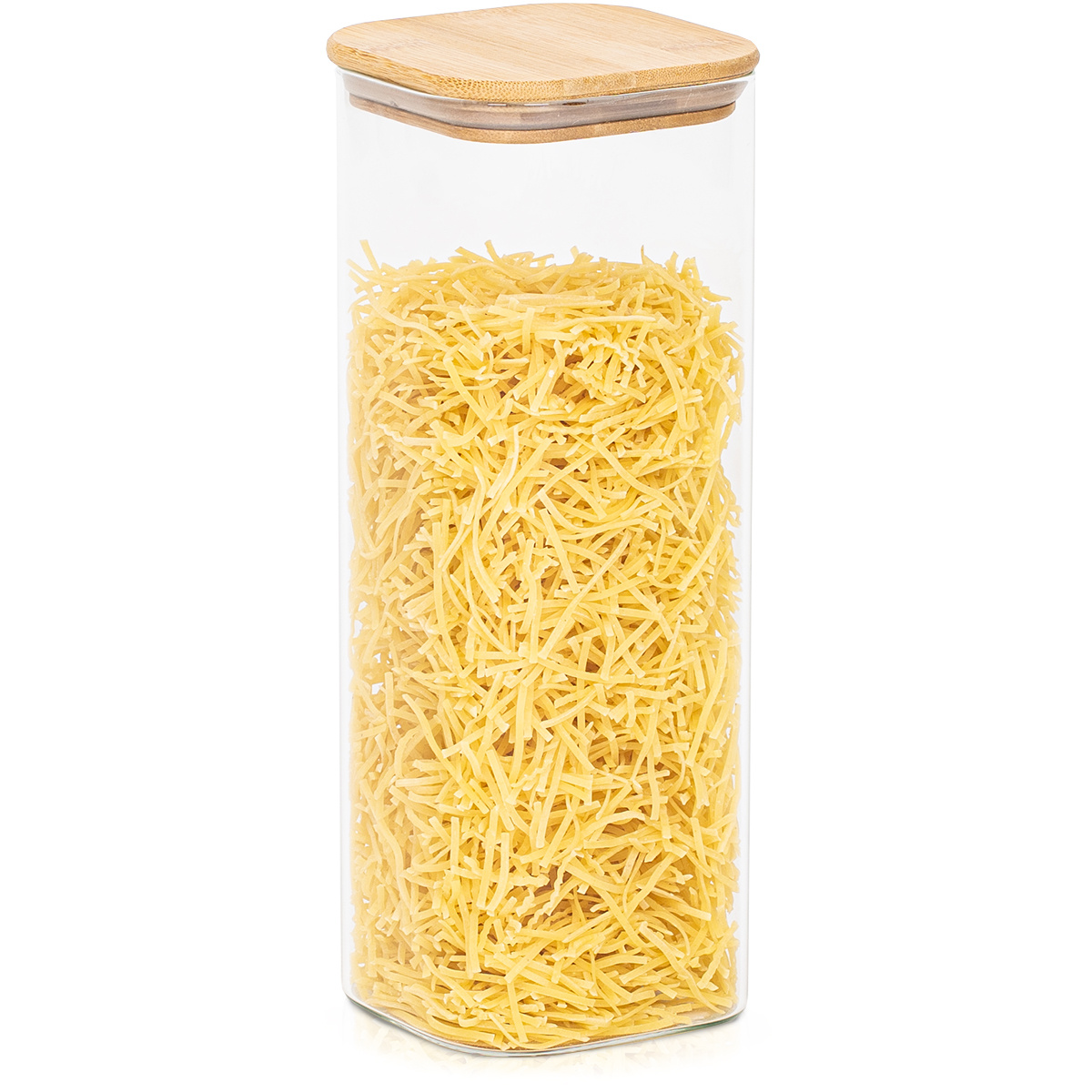 Dóza je vyrobená z kvalitného a odolného borosilikátového skla, ktoré nepohlcuje pachy ani farby a ľahko sa čistí. Veko z prírodného bambusu je vybavené silikónovým tesnením, ktoré zaisťuje dokonalú vzduchotesnosť. Vaše potraviny tak zostanú dlhšie čerstvé, chránené pred vlhkosťou a nechcenými škodcami.