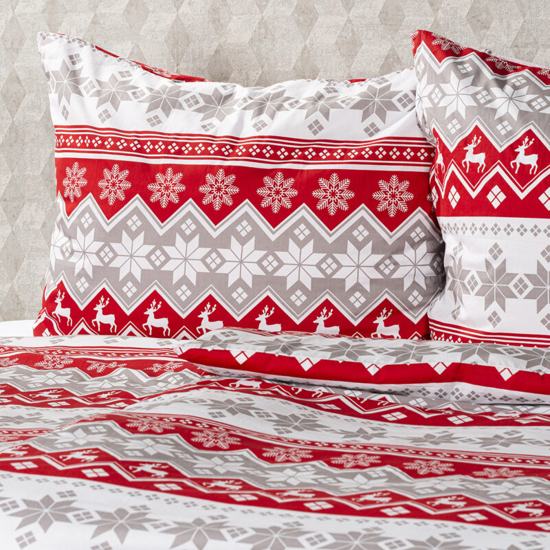 Bavlnené obliečky s tradičným nórskym vzorom urobia z dlhých zimných nocí váš najobľúbenejší čas roka. Koho by trápilo mrazivé počasie, keď sa môže zababušiť do pohodlných obliečok v obľúbenom a hravom severskom dizajne? Príjemná 100% bavlna zaistí pohodlný spánok a kombinácia červenej, sivej a bielej farby dodá sviatočné čaro vašej spálni. Motív je z oboch strán rovnaký a obliečky majú praktické zapínanie na zips.Súprava obsahuje:
