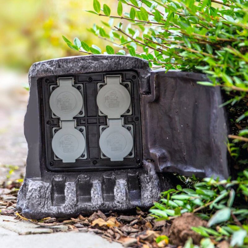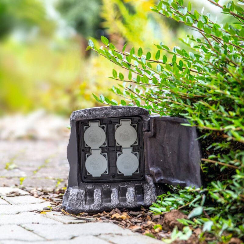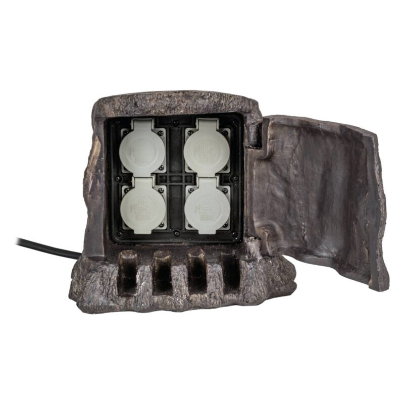 Peň stromu distribútora energie v klamne skutočnom vzhľade Vďaka štyrom zásuvkám na pripojenie osvetlenia alebo záhradného náradia je dekoratívny rozdeľovač energie vybavený klamne skutočným vzhľadom pňa. Pružinové sklopné veko je možné ľahko uzavrieť, aby zástrčky zmizli v pni, neviditeľné a chránené pred poveternostnými vplyvmi (trieda ochrany IP44). Rozvádzač napájania je dodávaný s 5 m dlhým pripojovacím káblom a je ho možné zaťažiť až do maximálnej výšky 3 680 W.
