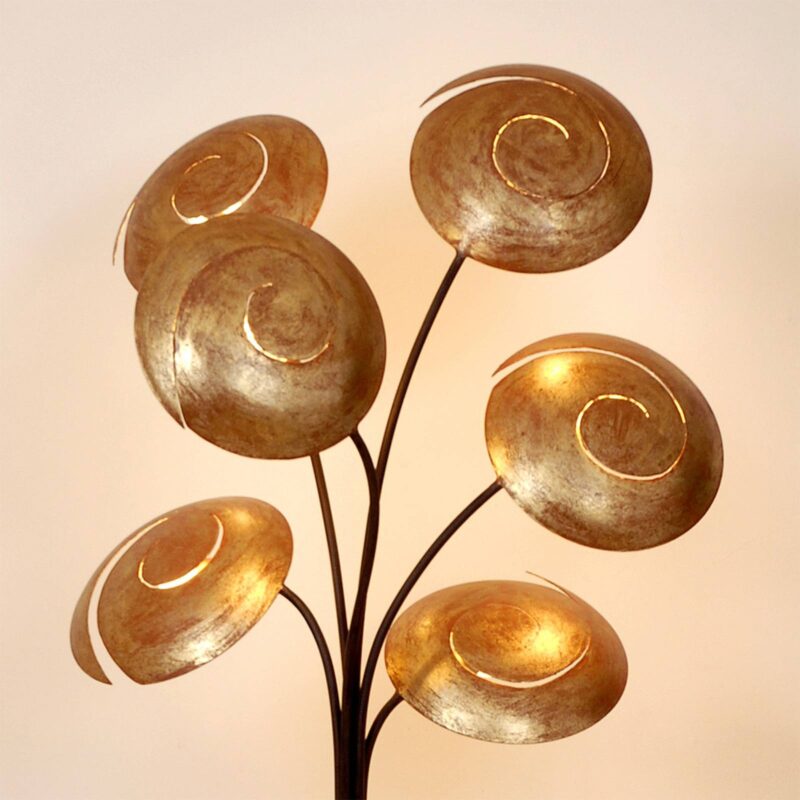 Stojacia lampa NUVOLA ponúka dokonalý dizajn a nádherné svetloStojacia lampa NUVOLA vyzerá ako kvet so štíhlym hnedým železným podstavcom a od neho sa odvíjajúcimi vzperami, na ktorých koncoch je ako jednotlivé kalichy umiestnených šesť krásnych kovových telies zlatej farby. Každé telo lampy má špirálovitú priehlbinu, ktorá slúži ako vzor aj ako priechod svetla. Stojacia lampa NUVOLA je výnimočný svetelný objekt a púta pozornosť v najrôznejších obytných priestoroch.