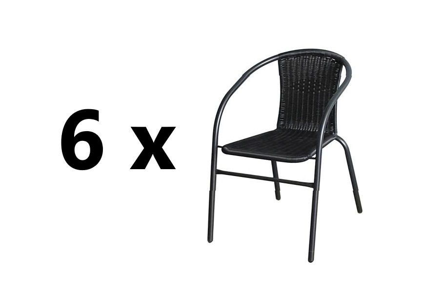 Set 6 ks záhradných stoličiek BISTRO II. Stolička je vhodná predovšetkým na použitie v záhrade, na balkóne alebo terase. Konštrukcia stoličky je vyrobená z čierneho kovu, ktorý je povrchovo upravený čiernou matnou farbou a sedacej časti z umelého ratanu. Použitie hliníkovej konštrukcie pre záhradný nábytok, ktorý potrebuje odolávať zvýšenej vlhkosti, je práve tou správnou voľbou. Hliníková konštrukcia je ľahká a nehrdzavie. Vďaka tomu s takouto konštrukciou budete bez starostí. Kreslo je pevné a stabilné a odolný umelý ratan ho robí odolnejším voči mechanickému poškodeniu. Technické údaje:materiál: ratan a oceľrám Ø: 24 mmratan Ø: 0,8 mmFarba rámu: čiernaratanová farba: čiernavýška sedadla: 42 cmhĺbka sedadla: 39 cmrozmery stoličky V / Š / H: 71 x 51 x 55 cmhmotnosť: cca 3,5 kg