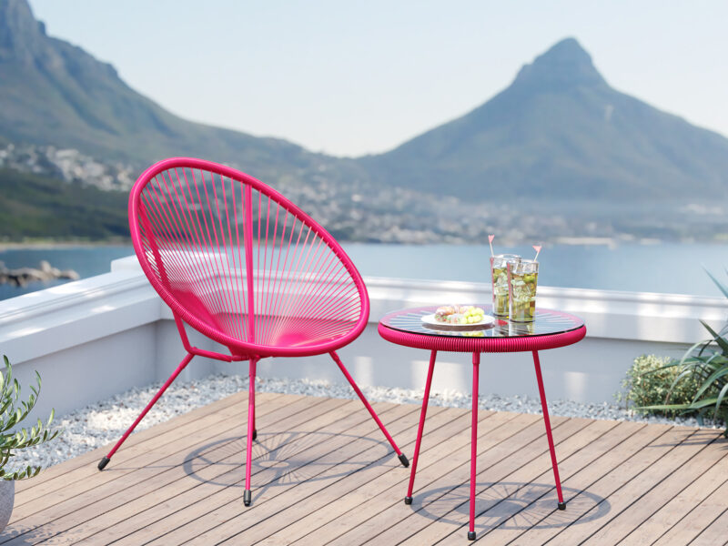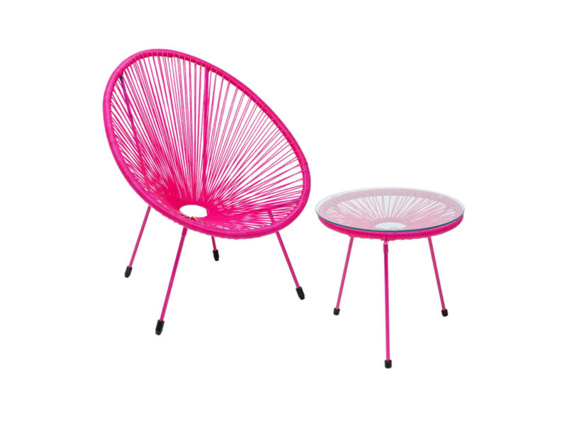 Set kresla a stolíka Acapulco vo výraznej ružovej farbe je štýlový a pohodlný doplnok, ktorý oživí každý exteriér. Oceľová konštrukcia s práškovým nástrekom, polyetylénový výplet a sklenená doska stolíka zaručujú odolnosť a stabilitu.