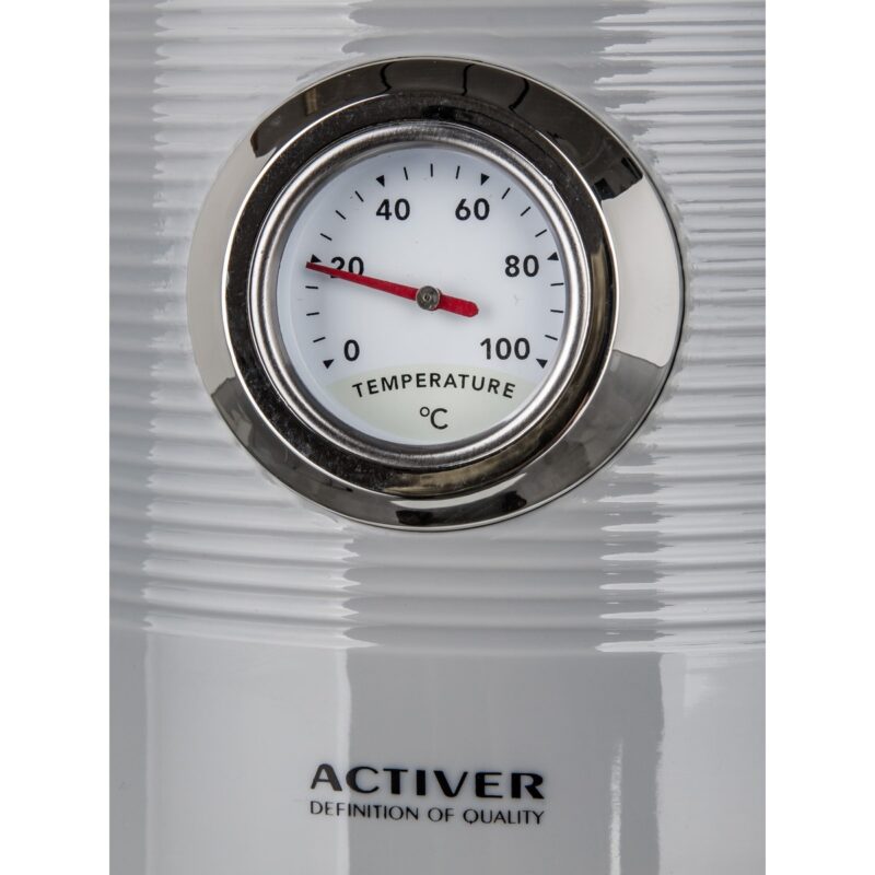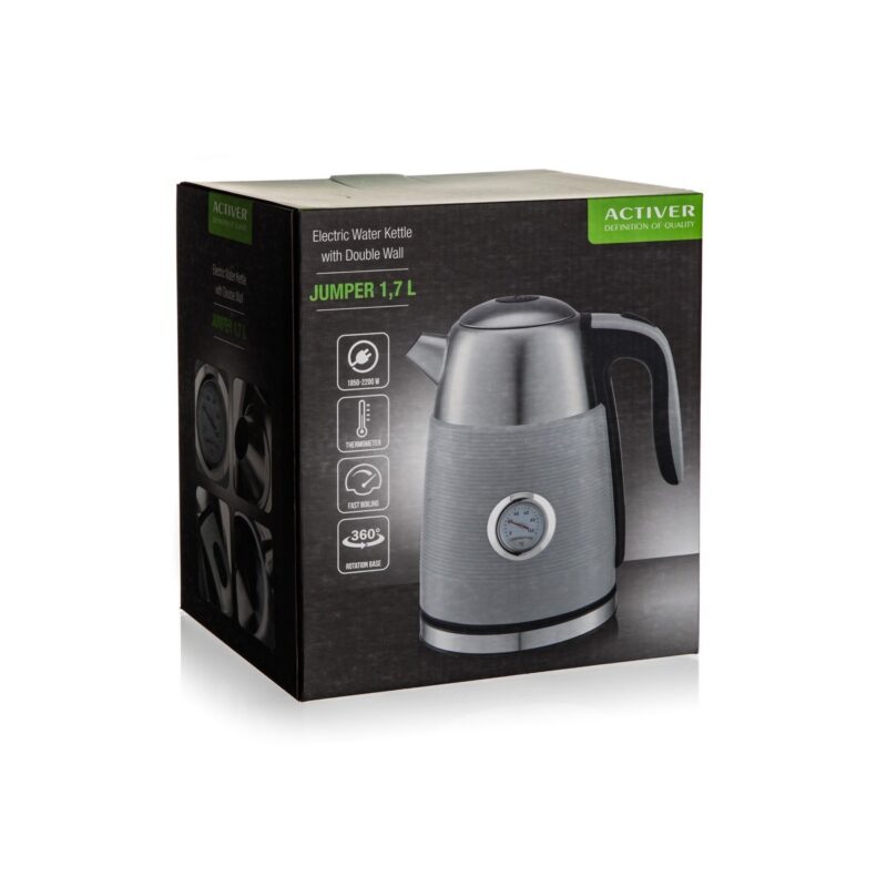 Moderná dvojstenná varná kanvica Jumper značky Activer je ideálny pomocník pre početnejšiu rodinu alebo do kancelárie. Designový doplnok každej kuchyne. Disponuje plochým dnom a nehrdzavejúcim telom s objemom 1,7 l. Pomocou analógového teplomera môžete sledovať teplotu vody. Kanvica je vybavená ochranou proti prehriatiu, má základňu so stredovým konektorom – voľne otočný o 360°, vstavaný filter proti hrubým nečistotám a automatické / manuálne vypnutie.Jedinečná dvojstenná konštrukcia zamedzuje popáleniu pri náhodnom dotyku, udržuje uvarenú vodu dlhšie teplú. Zároveň kanvica Jumper kombinuje výhody vnútornej nehrdz. vrstvy a vonkajšej plastovej. Príkon 1850 – 2200 W.