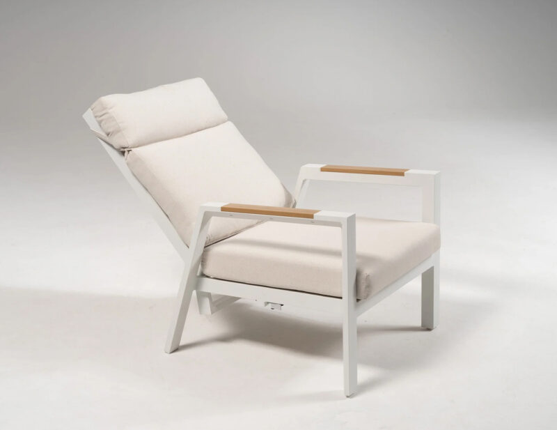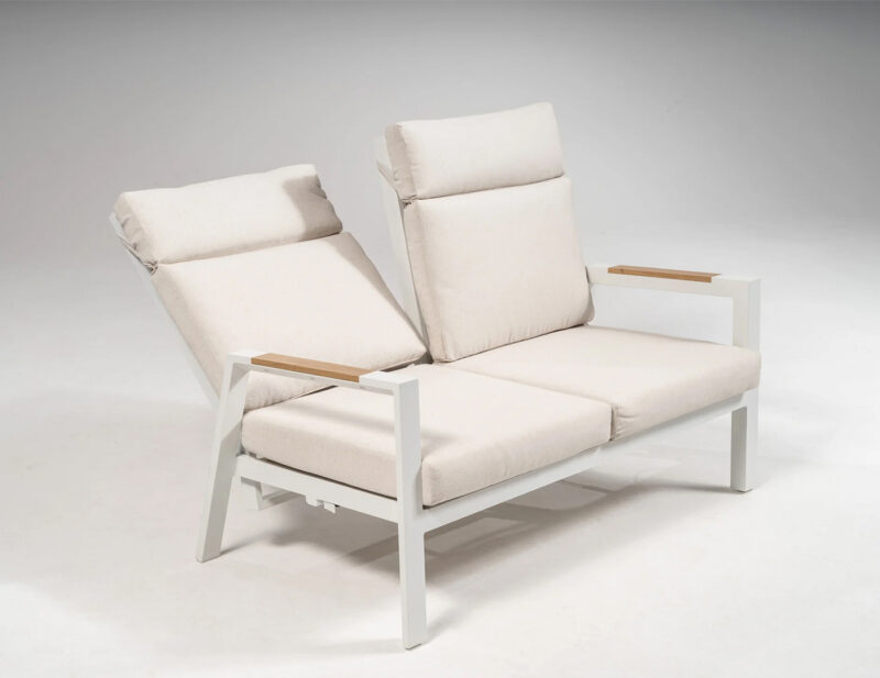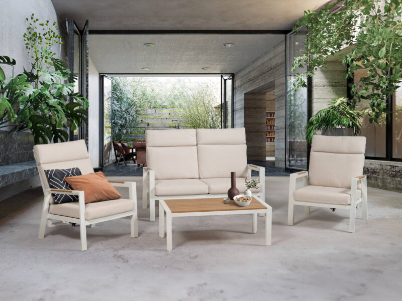 Sedacia súprava Agais ponúka ideálne miesto na oddych v exteriéri. Biely hliníkový rám v kombinácii s béžovou tkaninou odolnou voči poveternostným vplyvom a dreveným dekorom stolíka vytvára harmonický a príjemný dizajn. Polohovateľné operadlá zabezpečujú vysoký komfort.