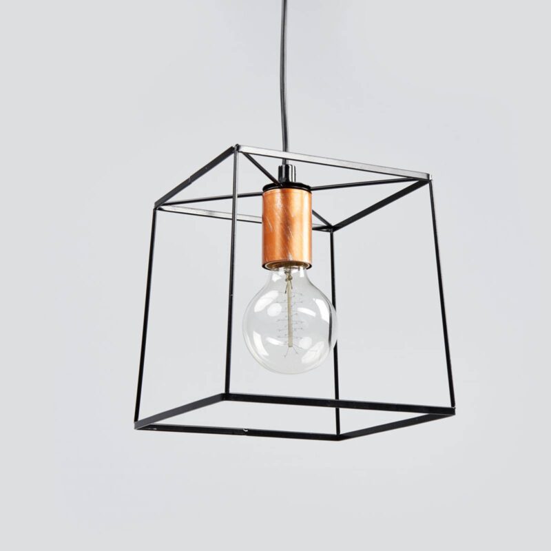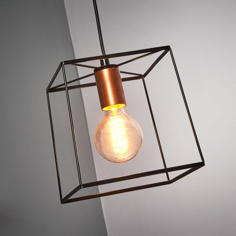 Rustikálna závesná lampa Agatha s minimalistickým tienidlom Ak sa závesná lampa Agatha vôbec dá nazvať konvenčným tienidlom, potom ju treba označiť za veľmi minimalistickú, pretože pozostáva len z kovového rámu, ktorý vyzerá ako model hrany kocky a obklopuje svetelný zdroj ako klietka. Objímka lampy je v kontrastnej farbe lesklej medi. Vizuálne vyzerá závesná lampa Agatha najlepšie, keď je objímka osadená žiarovkou s vintage vzhľadom.