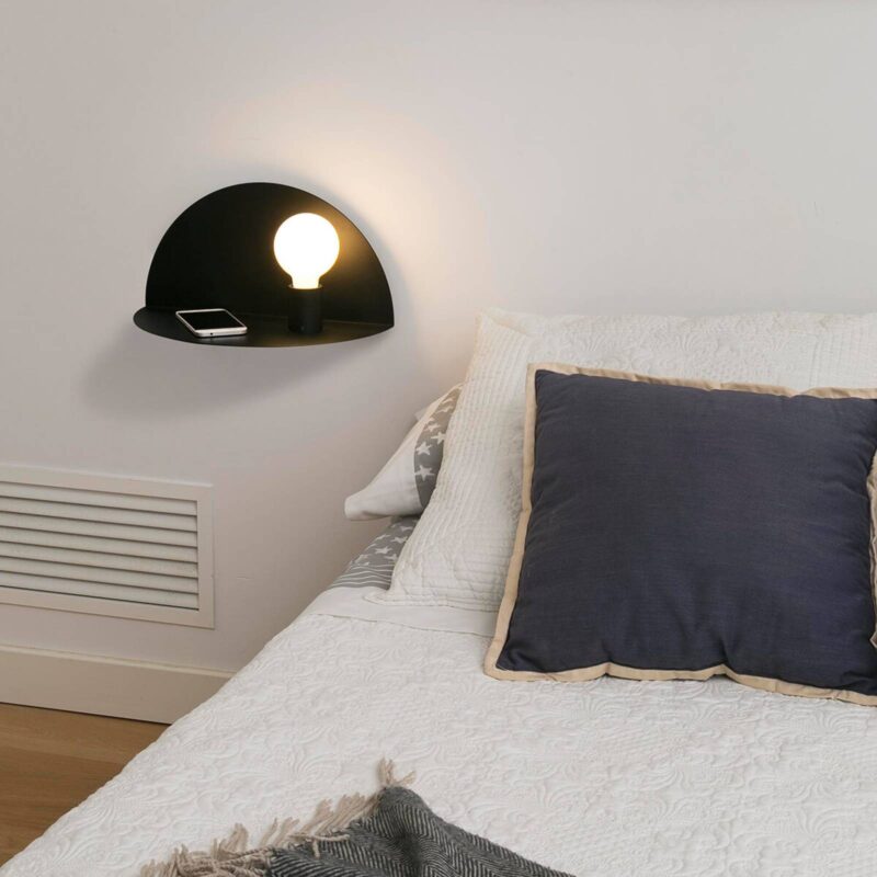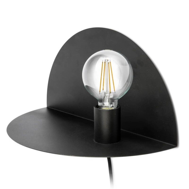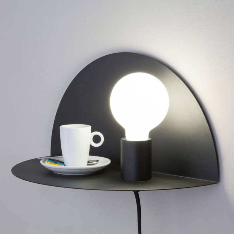 Čierne nástenné svietidlo Nit: zdroj svetla s poličkou Malé nástenné svietidlo Nit je vhodné do predsiene, obývacej izby alebo spálne. B. môže prevziať funkciu nočného stolíka v spálni. Integrovaná pätica E27 môže byť vybavená žiarovkou s maximálnym príkonom 20 wattov. Dekoratívnu hodnotu kombinácie stola a lampy je možné zvýšiť výberom dekoratívneho zdroja svetla. Žiarovky alebo rustikálne žiarovky – rovnako ako iné zdroje svetla – je možné vybrať z príslušenstva a objednať zvlášť. Vybavený vypínačom na kábli.