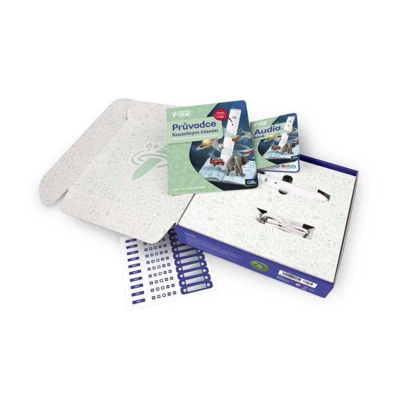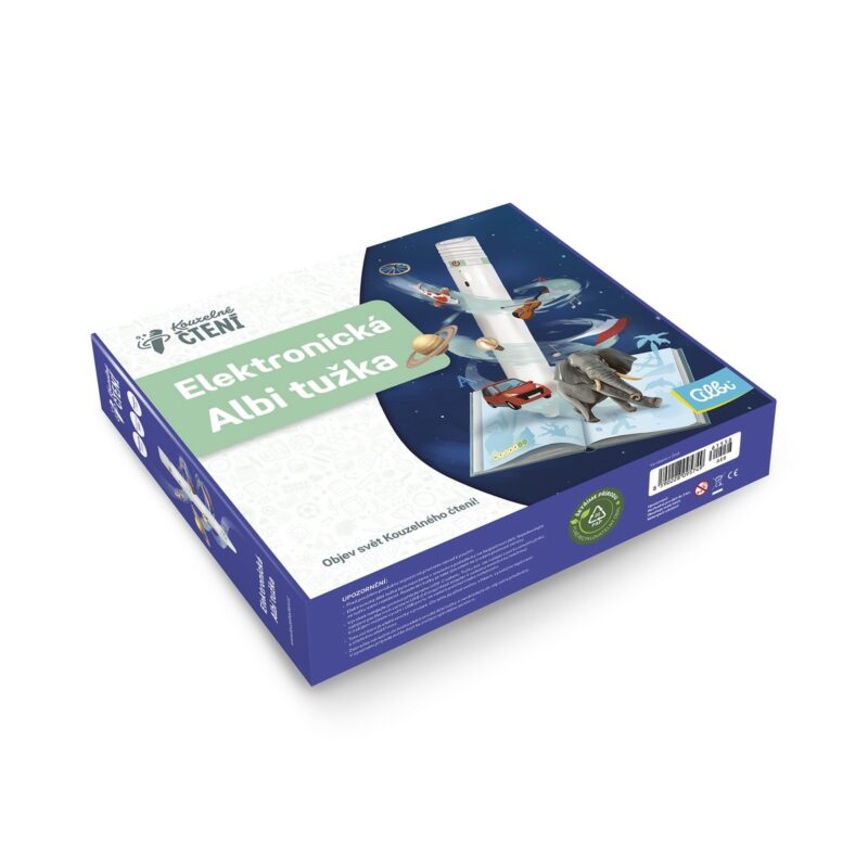 Obsah balenia: elektronická Albi ceruzka 2.0, Sprievodca Kúzelným čítaním, USB-C kábel, Audioblok, 10 kusov samolepiek MP3 prehrávača a 10 kusov samolepiek ovládanie hlasitosti.