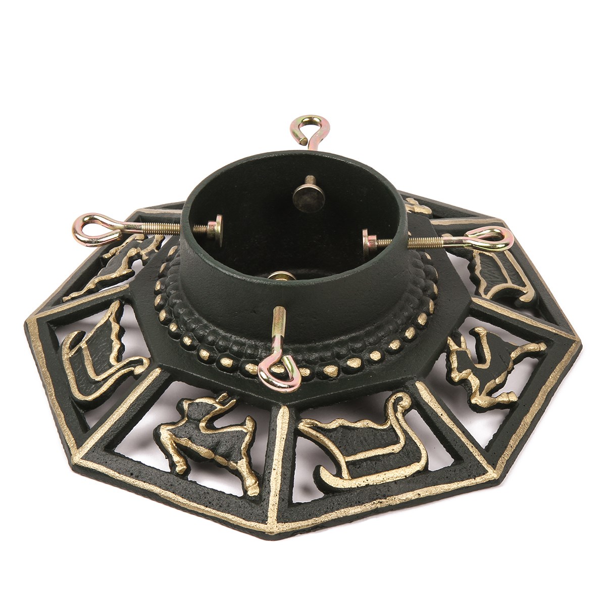 Krásne zdobený liatinový stojan na vianočný stromček, ktorý je pre svoju váhu vhodný aj pre veľké vianočné stromčeky do priemeru kmeňa 10 cm. Kmeň stromčeka v stojane upevníte štyrmi skrutkami. Vnútro stojanu slúži zároveň aj ako nádobka na vodu.