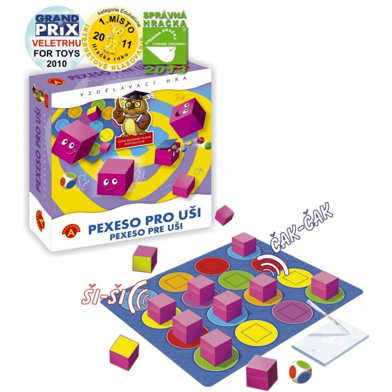 Kúpte svojim deťom toto originálne zvukové pexeso. Hľadáte dve kocky s rovnakým zvukom a môžete využiť aj ťažšiu variantu so špeciálnou farebnou hracou doskou. Tá je odporúčaná pred deti od 8 rokov.