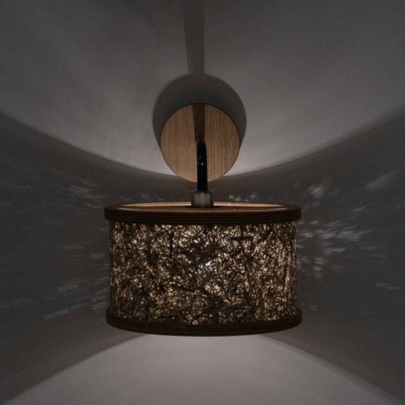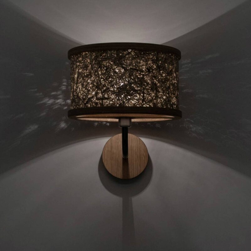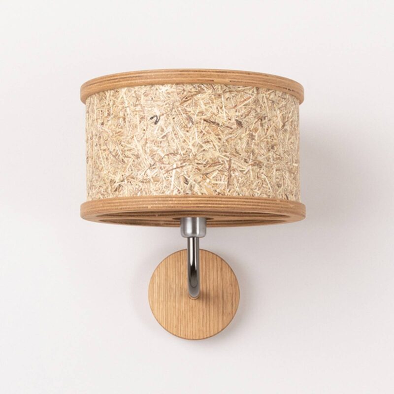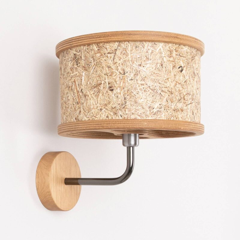 Valcové nástenné svietidlo 2610 z dreva a sena Nástenné svietidlo z dizajnového radu 2610 presvedčí svojím prírodným štýlom a vnesie do obývačky atmosféru tirolských hôr. Tienidlo je vyrobené z pravého tirolského horského sena a jeho rám, ako aj okrúhla strieška sú vyrobené z dubového dreva. Tienidlo podopiera kovové rameno naklonené nahor. Prírodné suroviny bez živočíšnych produktov spracúva rakúsky výrobca Almut von Wildheim na udržateľné a vegánske lampy, ktoré podporujú prirodzenú atmosféru.