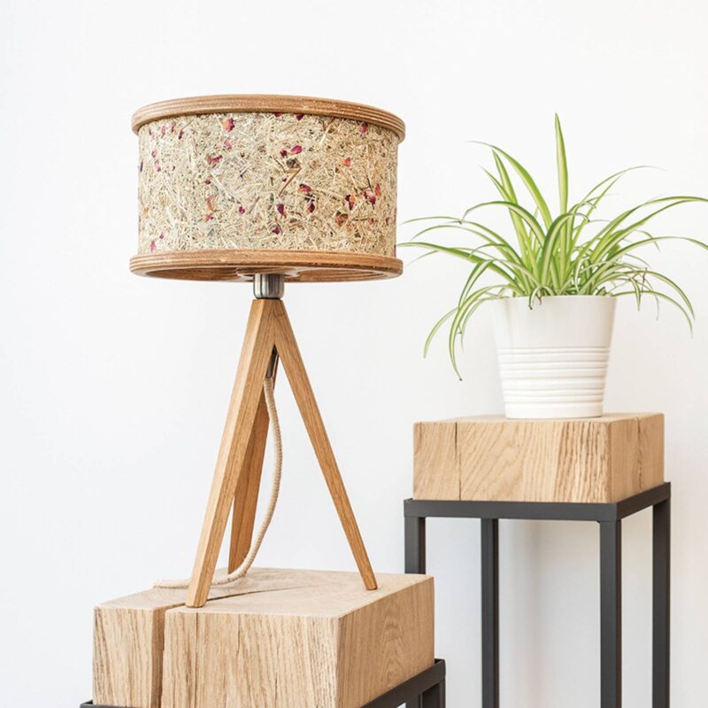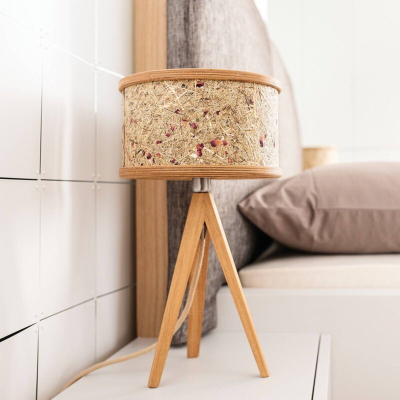 Prírodná stolová lampa na trojnožke 2610 z dubového dreva a sena Stolná lampa 2610 je príjemným doplnkovým zdrojom svetla a predstavuje prirodzený akcent v obývacej izbe alebo spálni. Dizajn je veľmi klasický – s valcovým tienidlom a rámom na trojnožke. Výber materiálu je absolútne moderný. Tienidlo je vyrobené z pravého lisovaného sena, ktoré je orámované okrajmi z dubového dreva. Ten sa používa aj na rám. Na pripojenie k elektrickej sieti a prevádzku je stolová lampa vybavená zástrčkou v plášti z jutového vlákna vrátane vypínača. Rakúska spoločnosť Almut von Wildheim, ktorá pôsobí od roku 2017, sa venuje výrobe vegánskych a udržateľných svietidiel. Tie sa vyrábajú v Európe z prírodných surovín, živočíšne produkty sa vynechávajú.