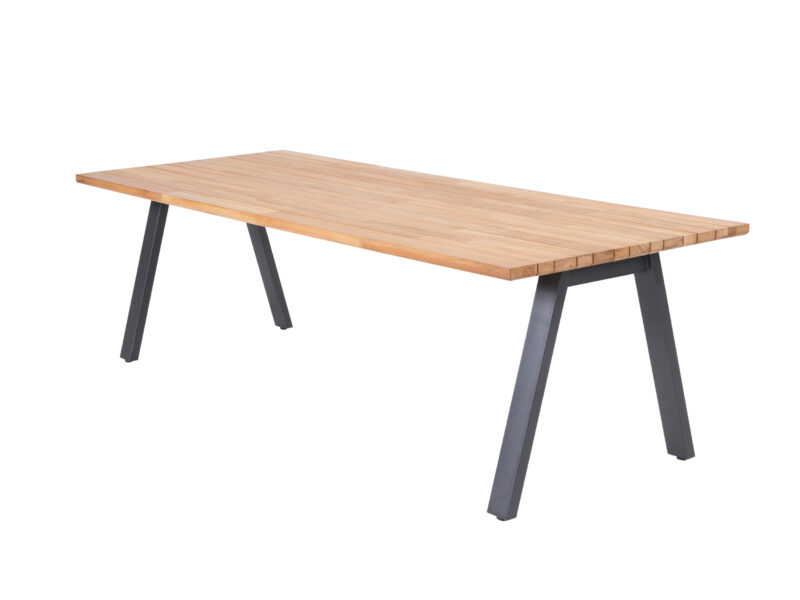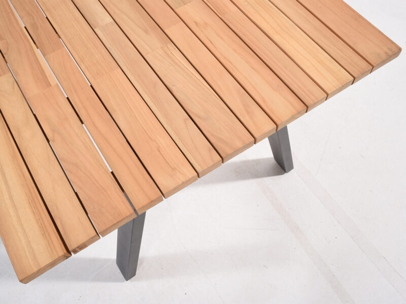 Elegantná záhradná súprava so stolom z teakového dreva a šiestimi pohodlnými stoličkami s výpletom z Hularo prútia. Dokonalá kombinácia prírodného vzhľadu, odolnosti a komfortu pre vašu terasu či záhradu.
