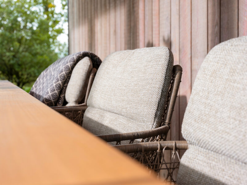 Elegantná záhradná súprava so stolom z teakového dreva a šiestimi pohodlnými stoličkami s výpletom z Hularo prútia. Dokonalá kombinácia prírodného vzhľadu, odolnosti a komfortu pre vašu terasu či záhradu.