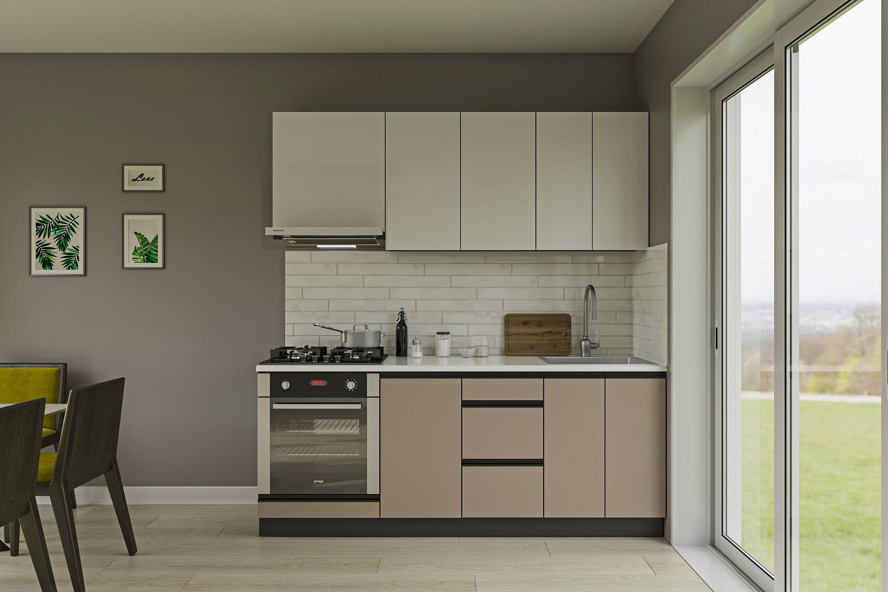 Moderná kuchyňa AMELY, ktorá vás zaujme svojim praktickým a zároveň štýlovým prevedením. Disponuje množstvom úložného priestoru. Je vhodná do moderných interiérov.Výška horných skriniek: 72 cm. Hĺbka: 30/32 cm. Výška dolných skriniek: 82 cm. Hĺbka: 46 cm.Sokel nie je v cene zostavy.Rozmery zostavy (š,h): 200 x 48 cm.Kuchynské skrinky sú vyrobené z kvalitných LTD dosiek. Ich údržba je nenáročná. Korpus je vo farbe grafit. Dvierka sú v vo farbe nymfea alba, clay grey. Majú integrované úchyty typu GOLA. Kuchynská zostava je zložená z týchto prvkov:horná skrinka nad digestor 60/68 cm, horná skrinka 80/72, horná skrinka 60/72, dolná skrinka na vstavanú rúru 60/82 cm, dolná skrinka 40/82 cm, dolná skrinka zásuvková 40/82 cm, dolná skrinka drezová 60/82 cmDrez a pracovnú dosku je potrebné dokúpiť, spotrebiče nie sú súčasťou kuchynskej linky. Kuchyňu je možné zakúpiť iba ako zostavu. Dodávame v demontovanom stave.