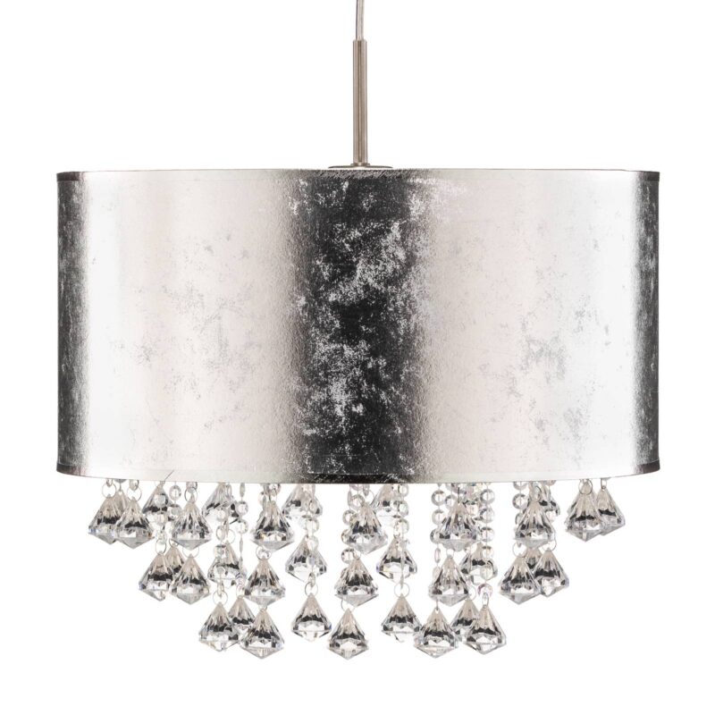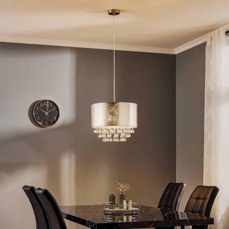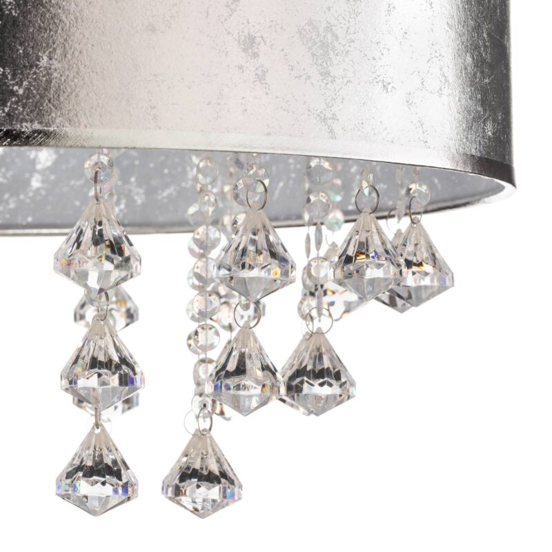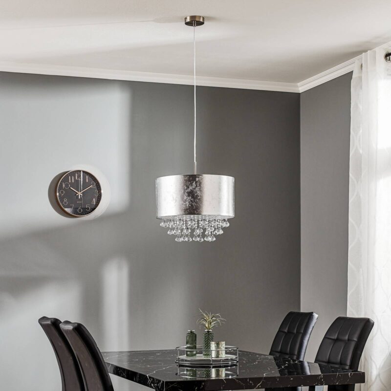 Závesné svietidlo Amy s textilným tienidlom v striebornej metalickej farbe s vkusnými závesnými prvkami – štýlový doplnok pre luxusnú atmosféru Vďaka svojmu elegantnému textilnému tienidlu vyzerá tento model moderne a efektne. Fantastické závesné prvky z filigránových sklenených krištáľov prepožičiavajú závesnému svietidlu Amy sviatočnú atmosféru a starajú sa o pôsobivú hru svetla. Dizajnéri textilného závesného svietidla Amy využili kontrast nepriehľadného vzhľadu tienidla a hravých priehľadných závesných prvkov a vytvorili tak živý dekoratívny prvok. Pomocou textilného závesného svietidla Amy možno veľmi šikovne vytvárať predovšetkým interiéry v luxusnom štýle. Okrem toho môžu z tohto atraktívneho svietidla profitovať aj moderné interiéry s vysokými nárokmi na štýl zariadenia. Závesné svietidlo Amy možno veľmi pôsobivo použiť nielen v obývacej izbe, ale aj v spálni. Na doplnenie koncepcie osvetlenia možno použiť buď ďalšie honosné alebo nenápadné zdroje svetla.