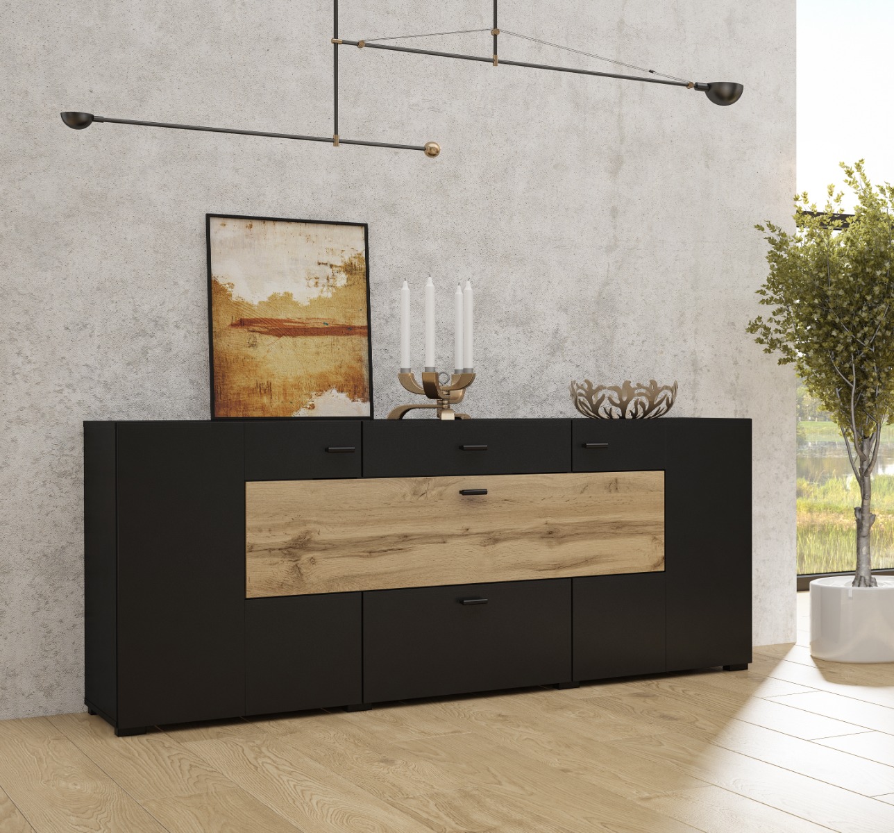 ANDY dvojdverová komoda 2D2S1V, čierny Onyx/dub Wotan