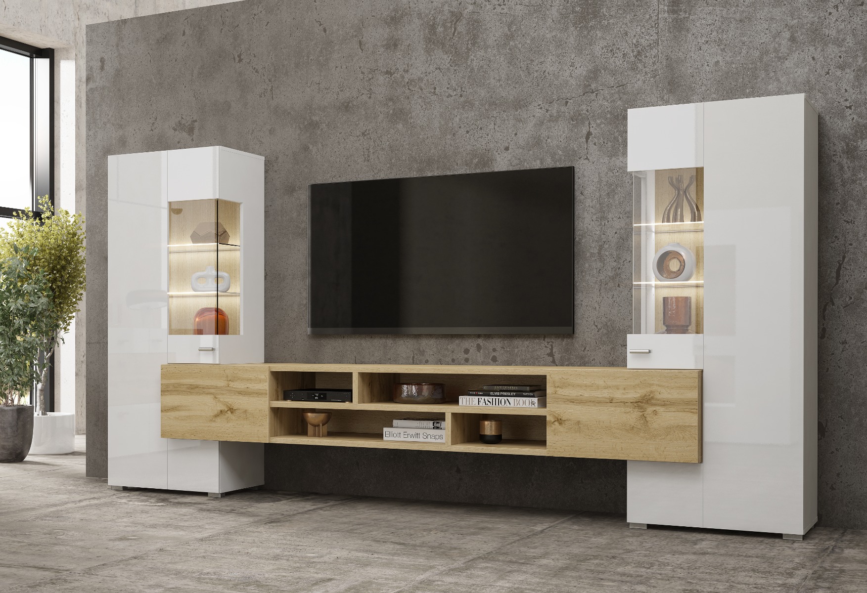 Obývacia stena ANDY – moderné a praktické riešenie pre vašu obývačkuObývacia stena ANDY je ideálnou voľbou pre tých, ktorí hľadajú štýlový a funkčný nábytok do svojej obývacej izby. Vďaka kombinácii bielej farby a dekoru dub Wotan vytvára elegantný a vkusný dizajn, ktorý zapadne do akéhokoľvek moderného interiéru. Stena ponúka dostatok úložného priestoru a zároveň pôsobí vzdušne a minimalisticky.Hlavné vlastnosti produktu:Typ tovaru: Obývacia stenaVhodné do miestnosti: Obývacia izbaMateriál: LTDRozmery: 143 x 270 x 45 cmFarba: Biela + dub WotanZostava obsahuje:2x vitrína – 55x39x143 cm1x závesný TV stolík – 208x45x32 cmDodatočné informácie: Dodávame v demonteObývacia stena ANDY je skvelým riešením pre tých, ktorí chcú elegantný a pritom praktický nábytok. Ponúka dostatok úložného priestoru pre vaše veci, pričom zachováva moderný a ľahký design.