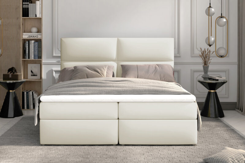 Manželská posteľ Angelina patrí k boxpringovým posteliam, ktoré zosobňujú eleganciu, luxus a pohodlný odpočinok v jednom. Je vyrobená z kvalitných materiálov, čo zaisťuje jej dlhodobé používanie. Poskytuje vysoký komfort, ktorý ocení aj náročnejší zákazník. Táto moderná boxpringová posteľ sa stane neoddeliteľnou súčasťou vášho domova.V spodnej časti postele Angelina sa nachádzajú 2 priestranné úložné priestory. Nad úložným priestorom je zabudovaný matrac, ktorý je vyplnený bonellovými pružinami v spojení s PUR penou o hustote T-25. Na ňom sa nachádza TOPPER – vrchný krycí matrac. Je vyplnený kvalitnou PUR penou. Topper eliminuje medzeru medzi matracmi a vytvára tak hladký povrch na spanie. Vysoké čelo postele slúži ako mäkká opierka hlavy. Plní nie len estetickú funkciu, ale tiež chráni stenu pred oderom. Manželská posteľ Angelina je čalúnená pevnou a kvalitnou ekokožou Soft 33.  Rozmery postele (š,v,h): 185 x 124 x 210 cm. Výška spacej plochy: 54 cm. Výška nožičiek: 3 cm. Spacia plocha: 180 x 200 cm. Výška matraca: 15 cm. Výška toppera: 4 cm. Ďalšie charakteristiky:Tvrdosť matraca – H3Jednostranný matracHypoalergénny poťahPoťah je snímateľný (na zips) – možnosť prať na 40°CV našej ponuke nájdete aj ďalšie prevedenia tejto štýlovej postele.Dodávame v demontovanom stave.