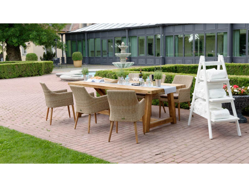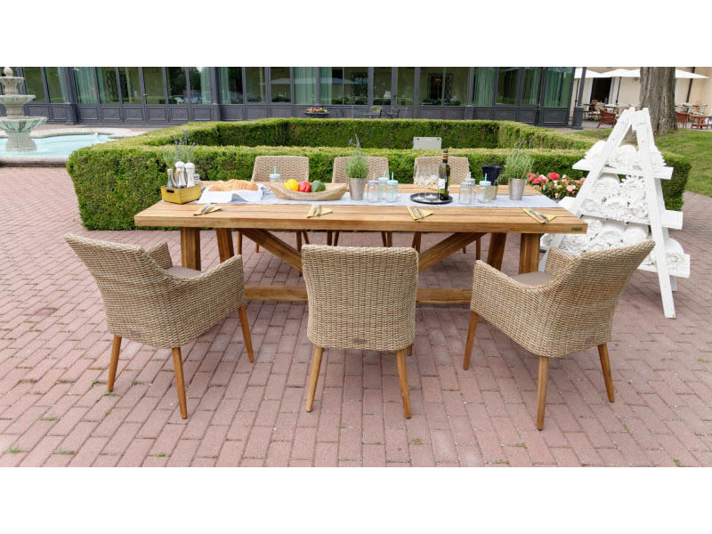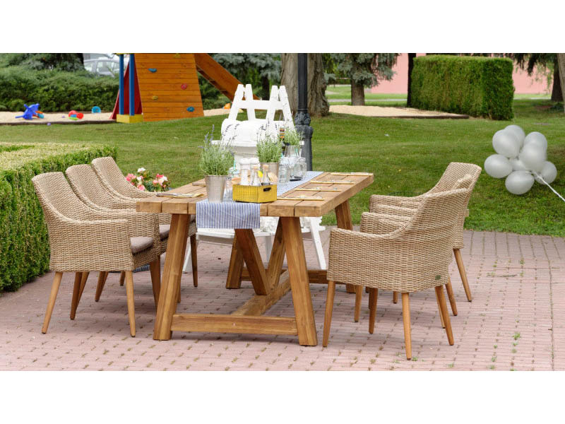 Moderná a zároveň klasická exteriérová stolová súprava Antigua Faro natur v kombinácii stola z masívneho akáciového dreva a 6-tich pohodlných kresiel v prirodzenom prevedení ratanového výpletu.