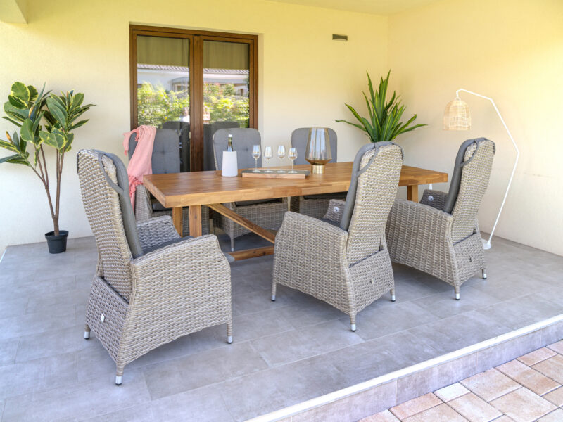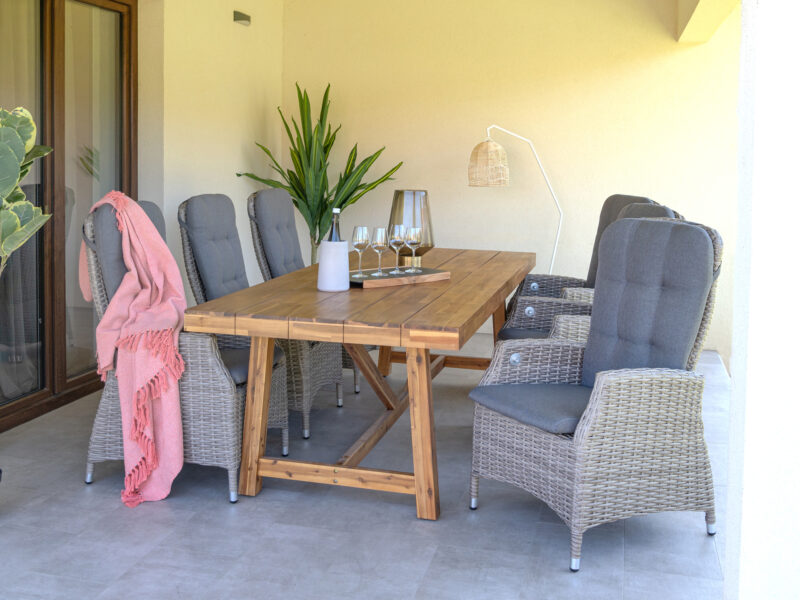 Stolová súprava Antigua Soho je spojením elegancie, štýlu a účelnosti masívneho stola s polohovateľnými kreslami.